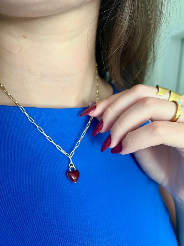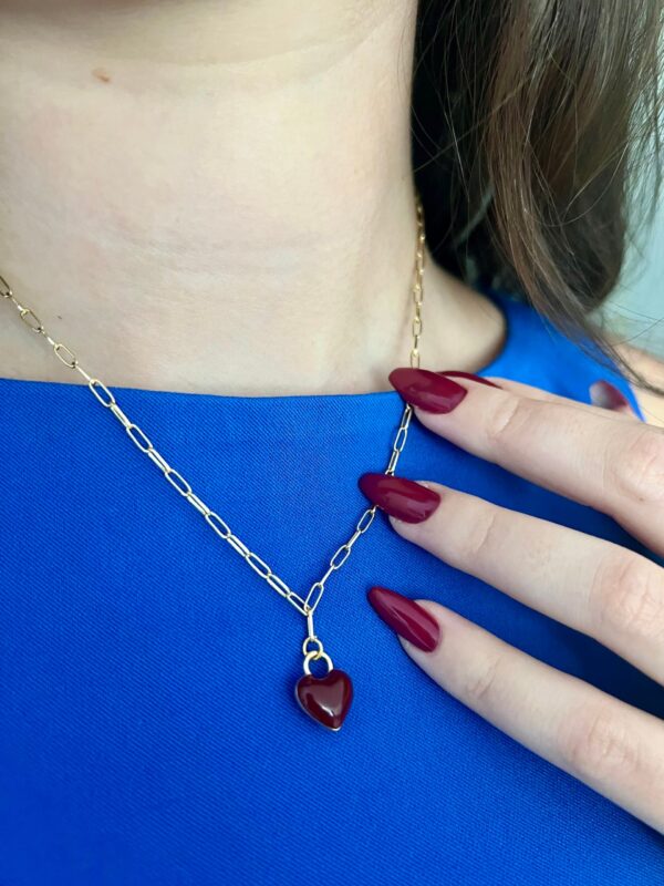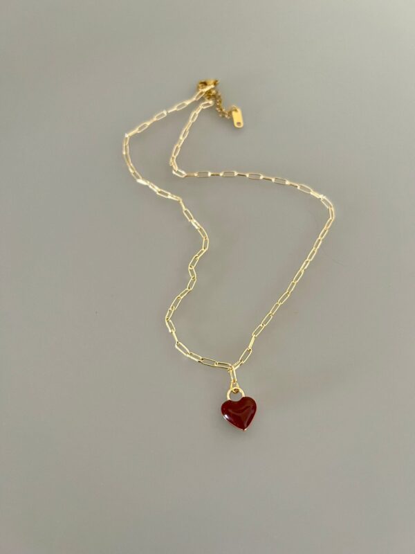 שרשרת לולאות אליפטיות קטנות אל חלד ותליון לב עדין עשוי אמייל בורדו .