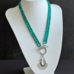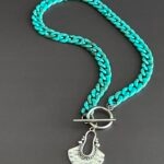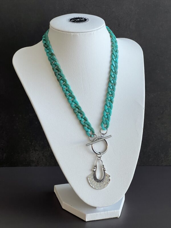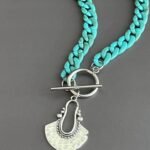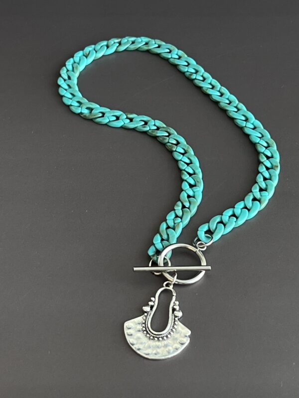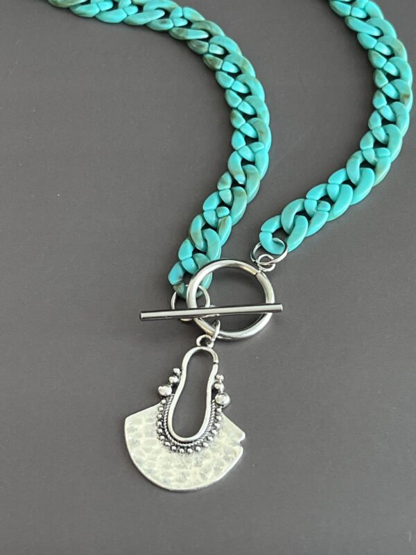 שרשרת שיקית מלאה סטייל עשויה לולאות אקריליק בגוון טורקיז עם תליון כסוף בעיצוב אתני .