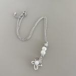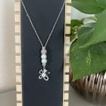 שרשרת לולאות אל חלד עם גדיל חרוזים כסופים ודמוי פנינים עם תליון פרח משובץ פנינה .