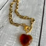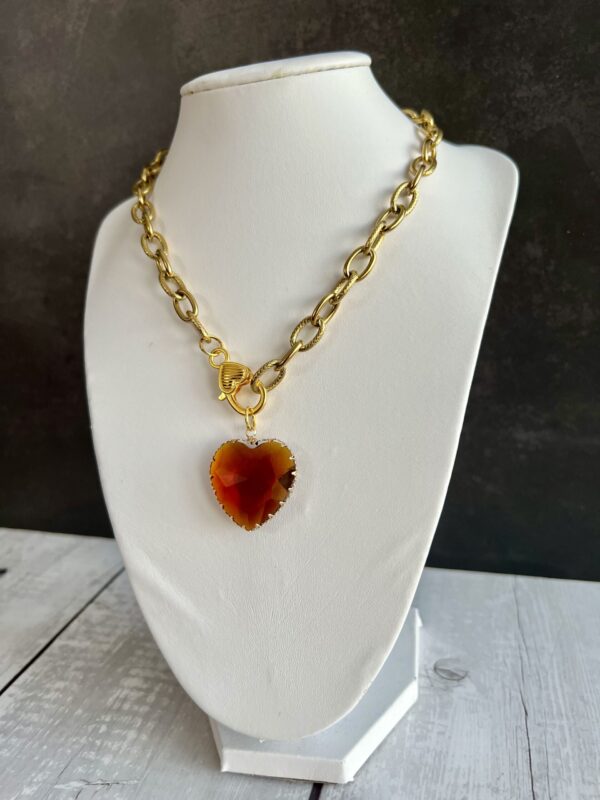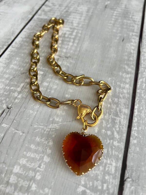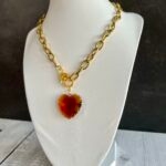 שרשרת לולאות אל חלד בציפוי זהב איכותי עם תליון לב אקרילי בגוון אמבר ממוסגר בזהב .