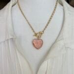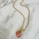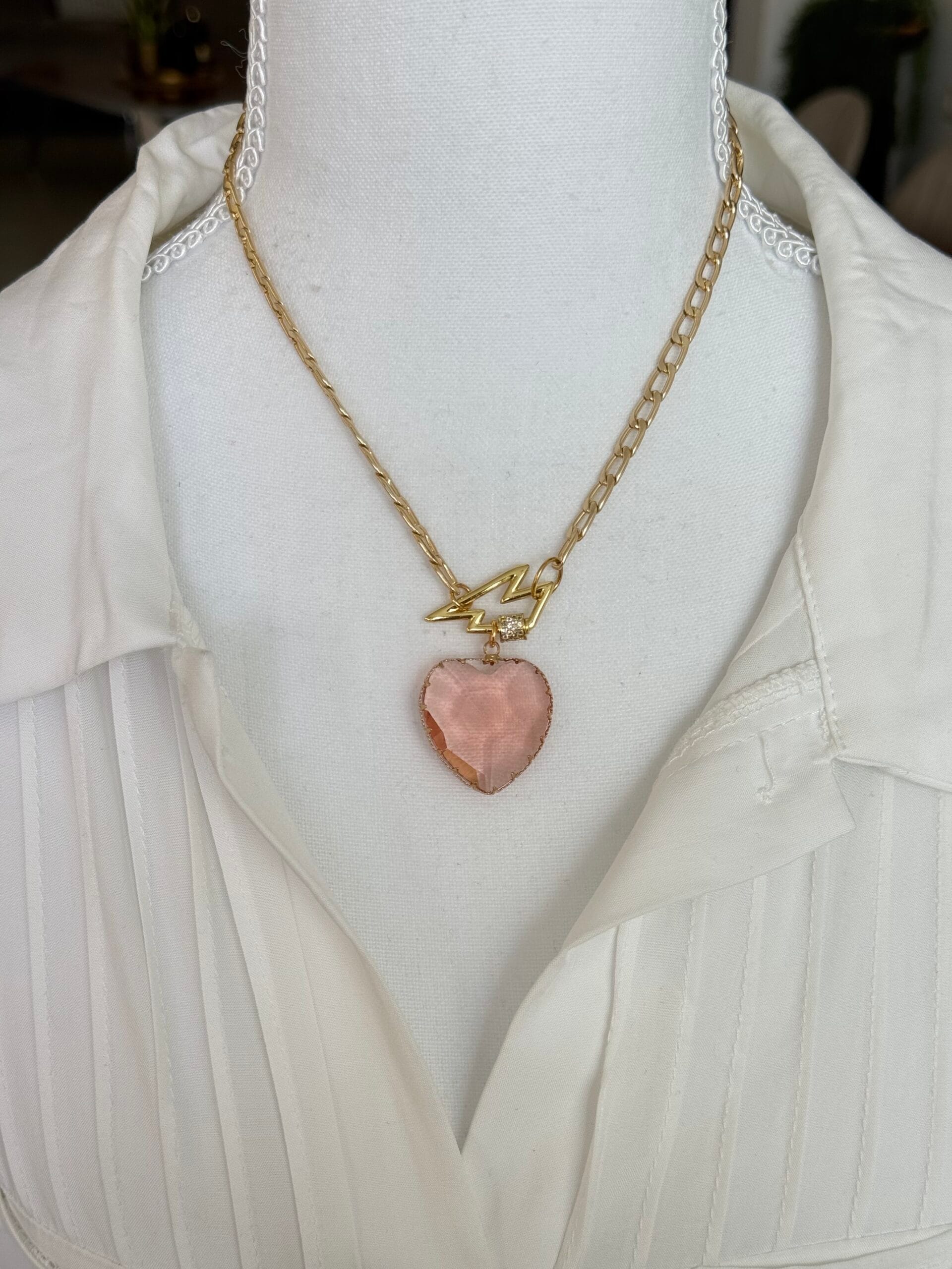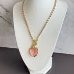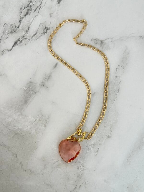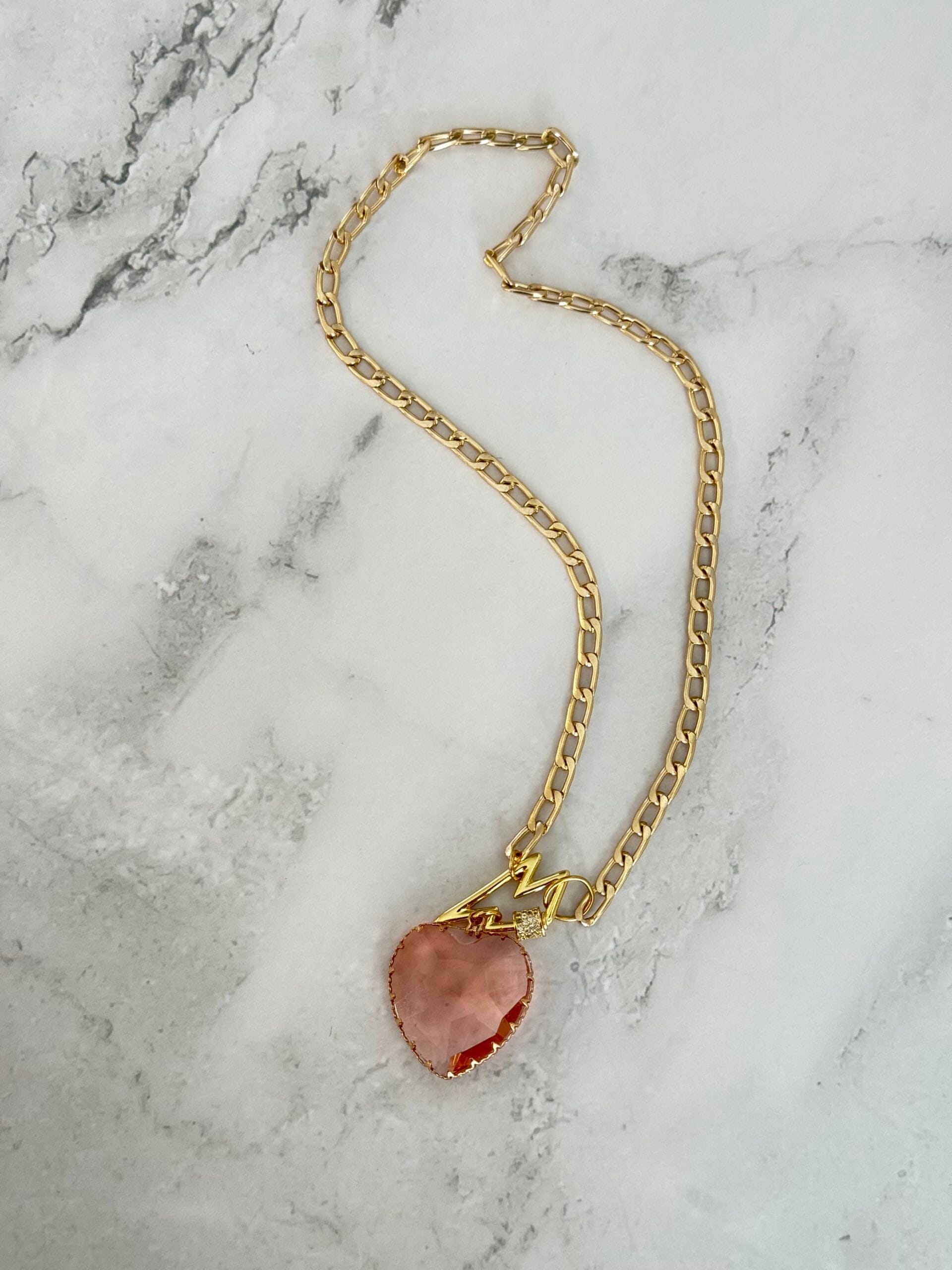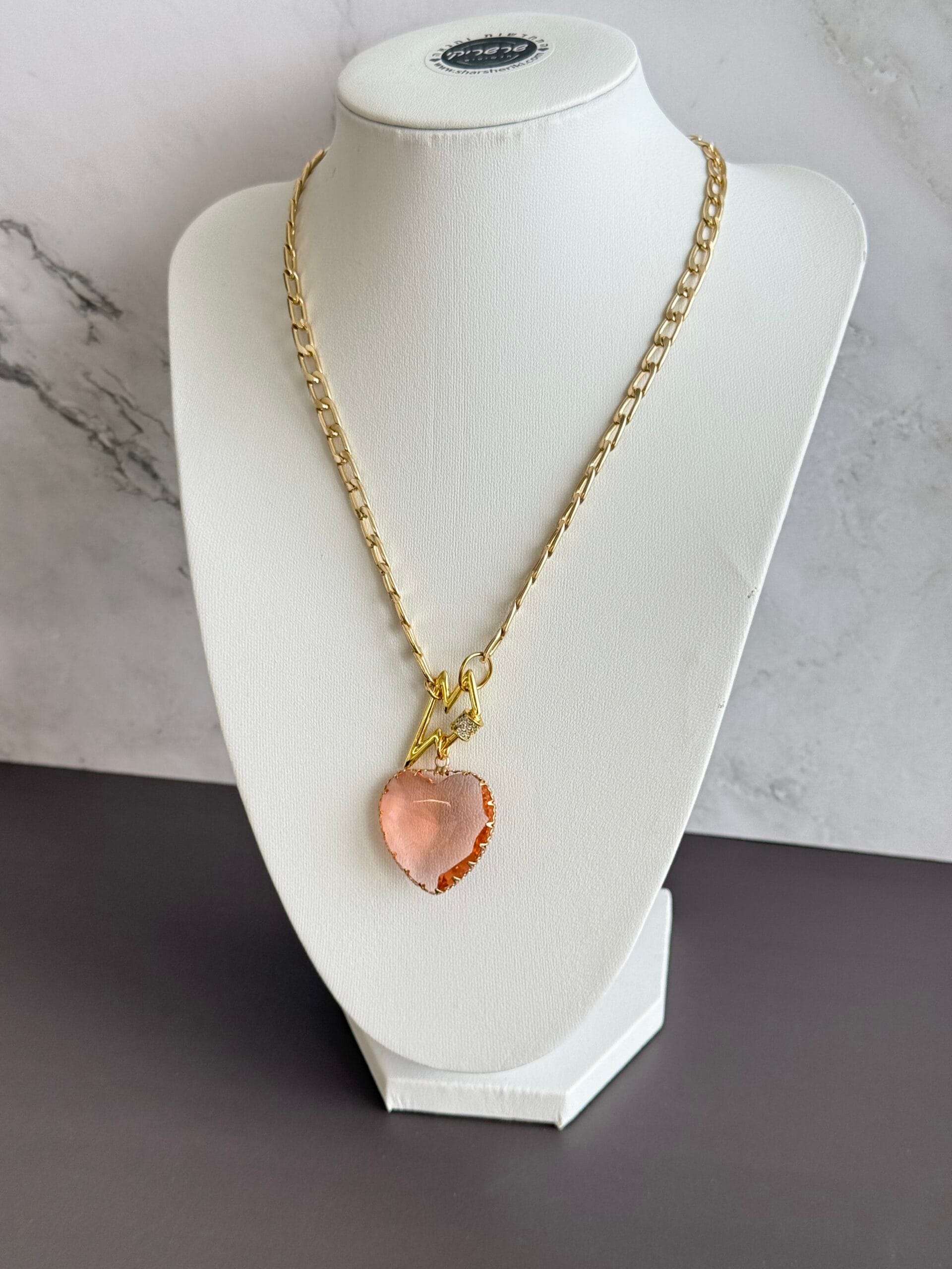 שרשרת לב ורוד עשויה מלולאות אלומיניום קלילות בציפוי איכותי בגוון זהב ובמראה עשיר עם תליון מרקיזה ורוד שקוף למחצה, וסגירה קדמית עם קרבינה אל חלד משובצת באבנים קטנטנות במראה יוקרתי .