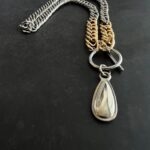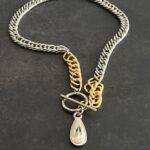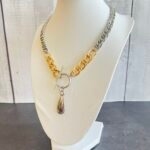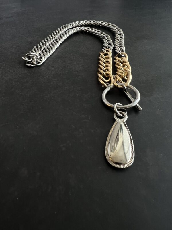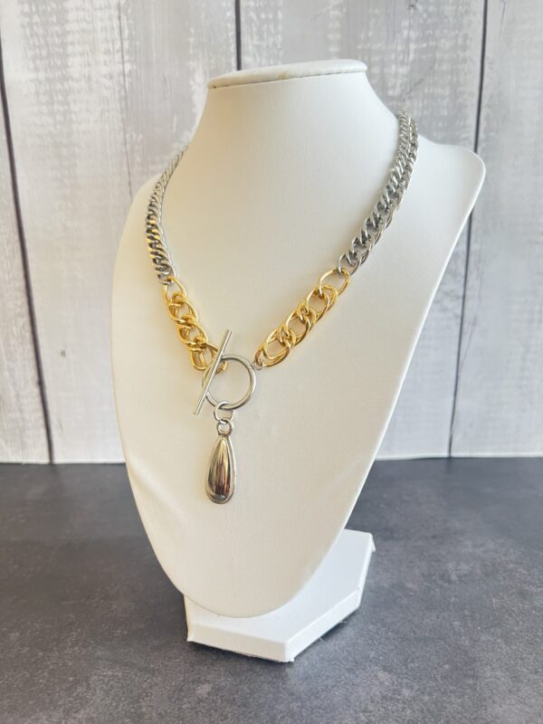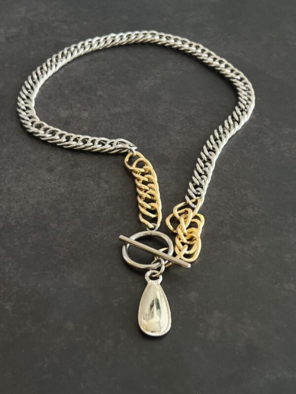 שרשרת לולאות עבות בשילוב צבעים כסוף וזהב עם תליון טיפה כסופה.