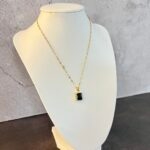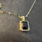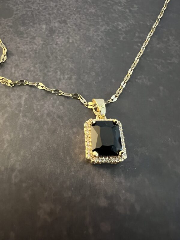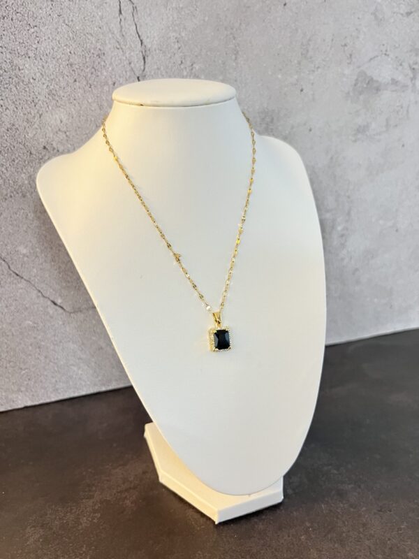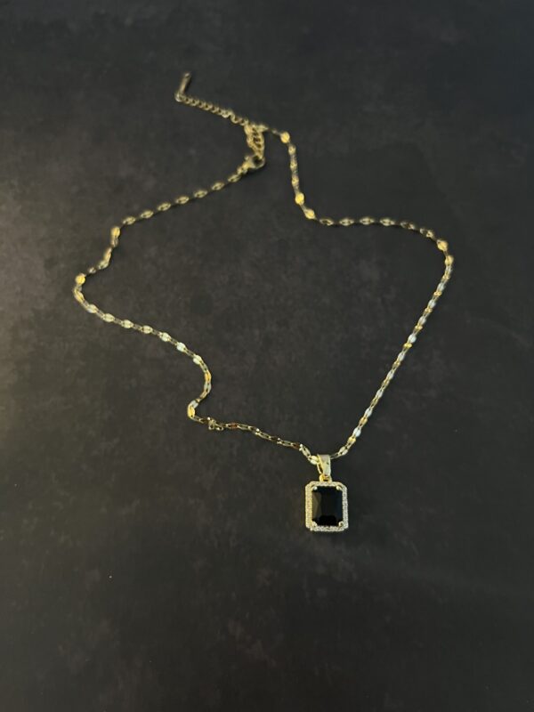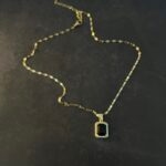 שרשרת לולאות בציפוי זהב עם תליון מרקיזה מלבני משובץ אבן מרכזית שחורה וזירוקנים.