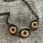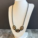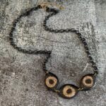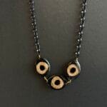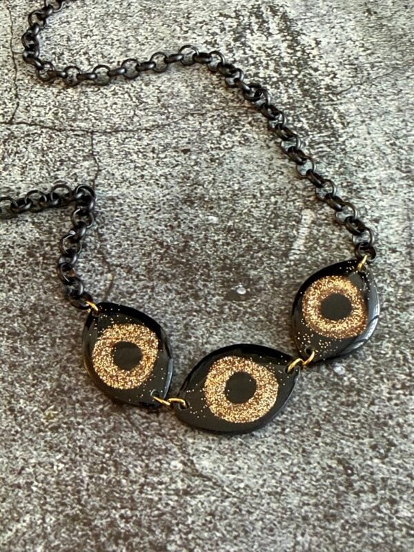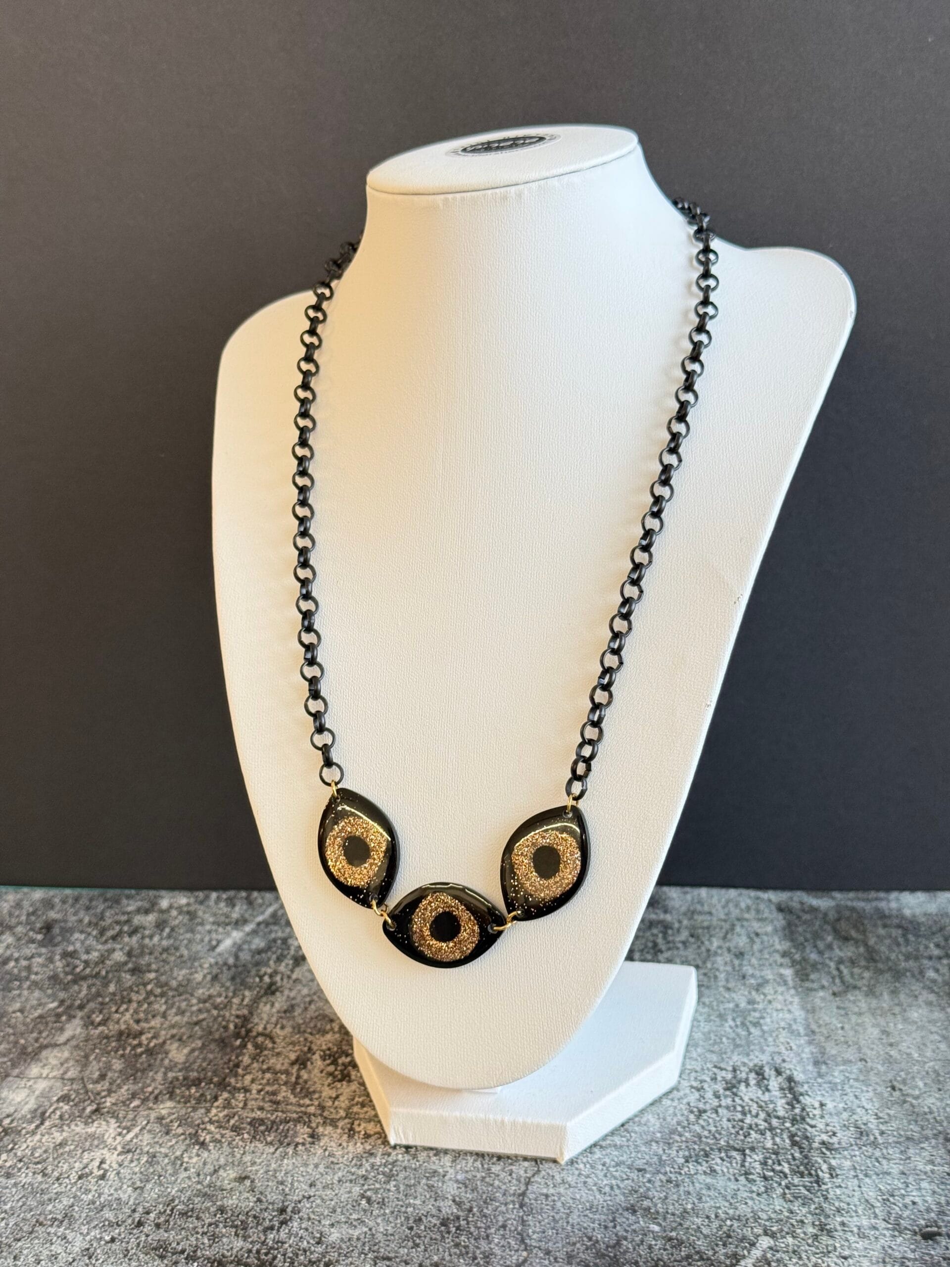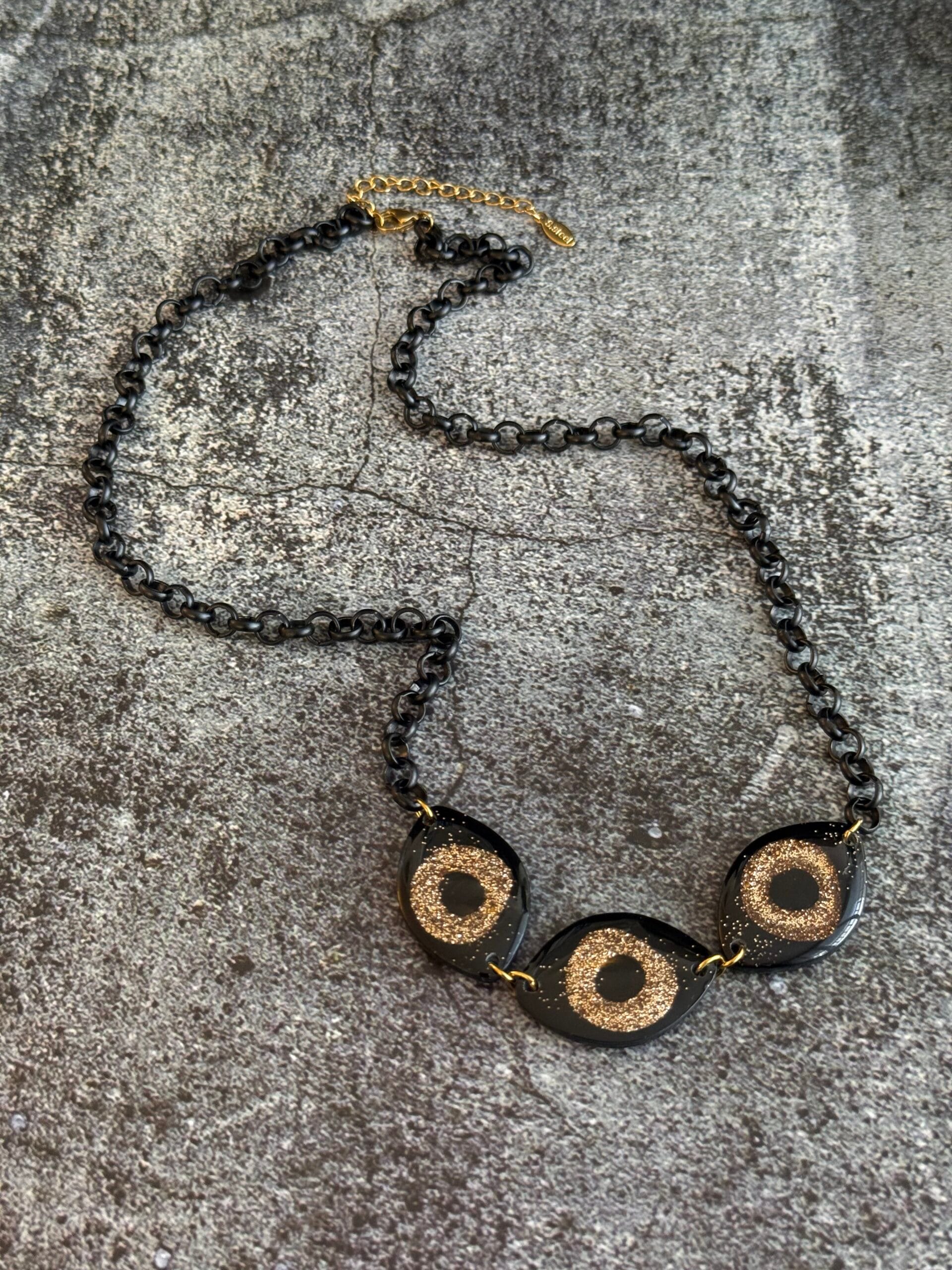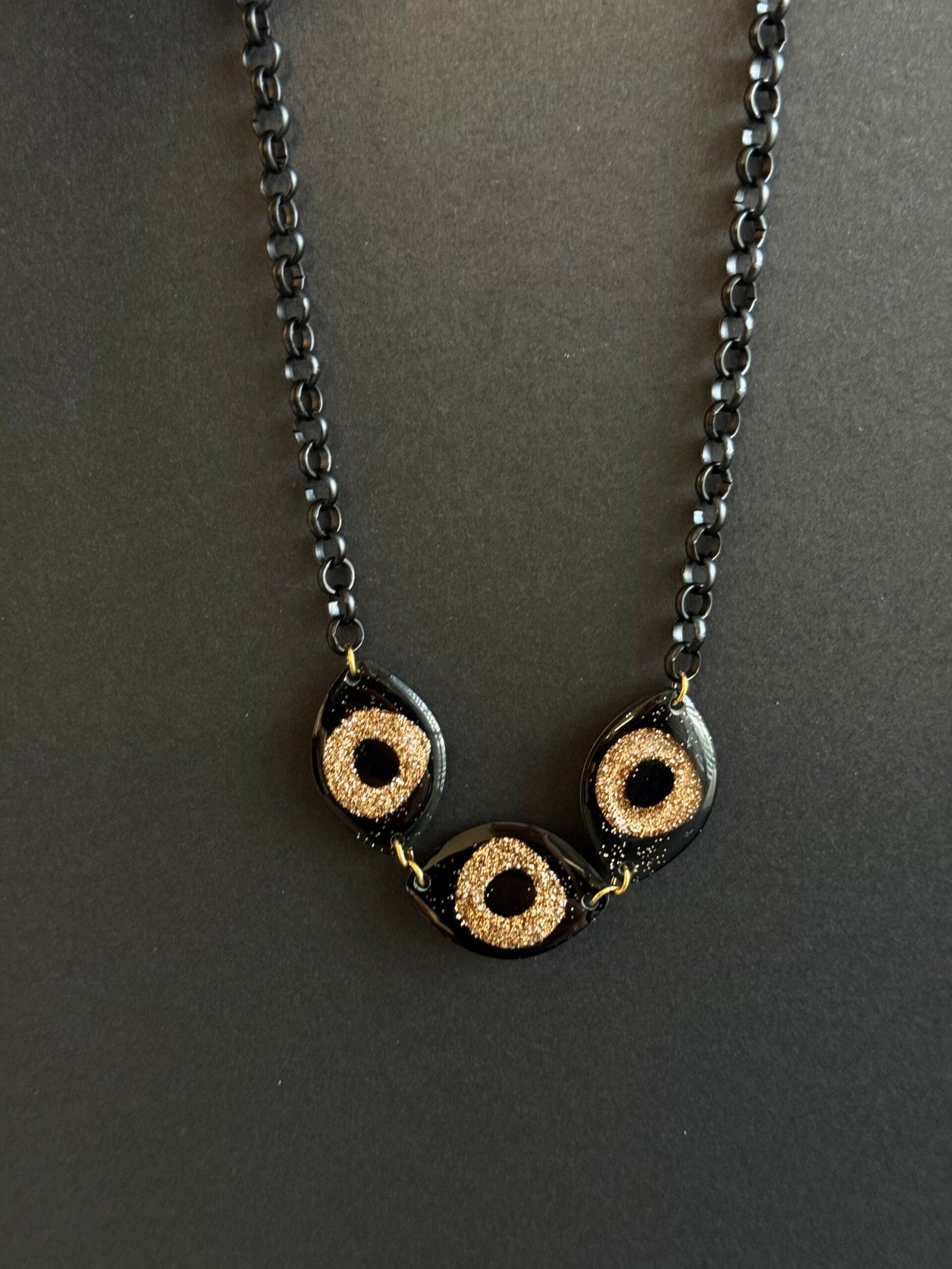 שרשרת לולאות שחורות עם שלושה תליוני עין אקריליק בגוון שחור עם זהב נצנצים.