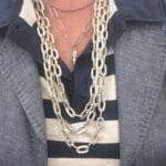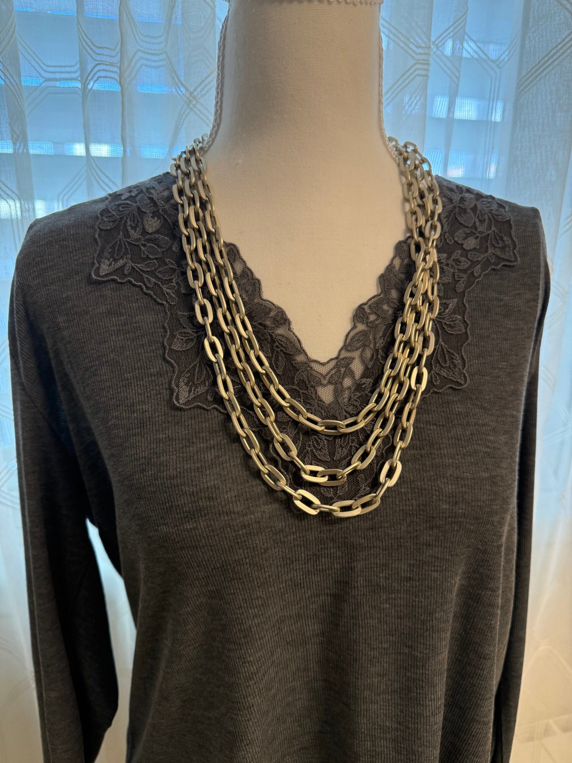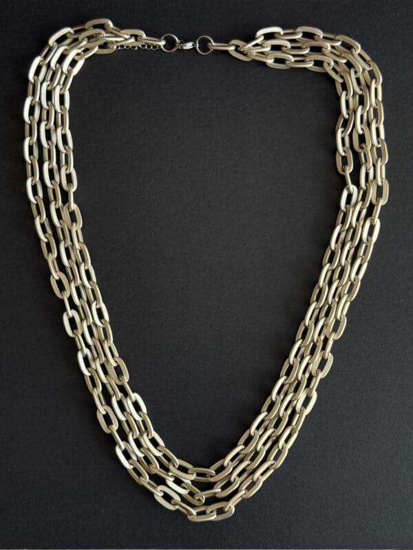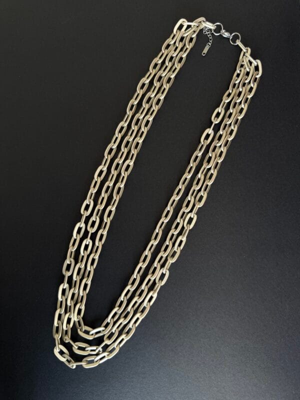 שרשרת ארוכה עשויה שלוש שכבות של לולאות אלומיניום כסופות בגימור מט קלילות בציפוי איכותי ועמיד השרשרת תשב על הצוואר בנוחות ותקפיץ לך את הלוק.