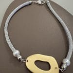 שרשרת עשויה מחבל ארוג כסוף ואלמנט מוזהב במרכז ומצדדיו חרוזי פנינה.