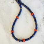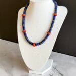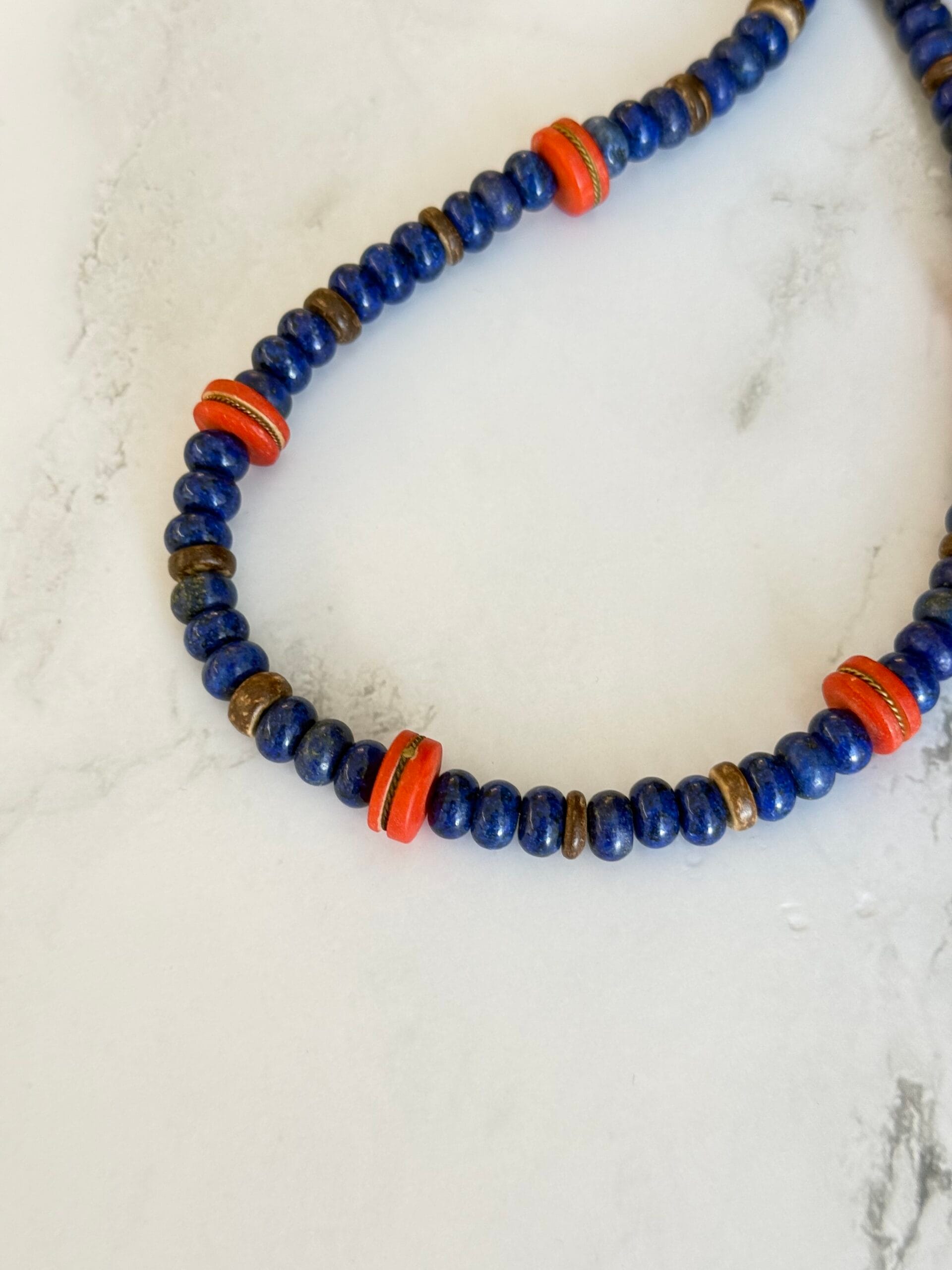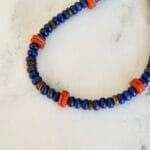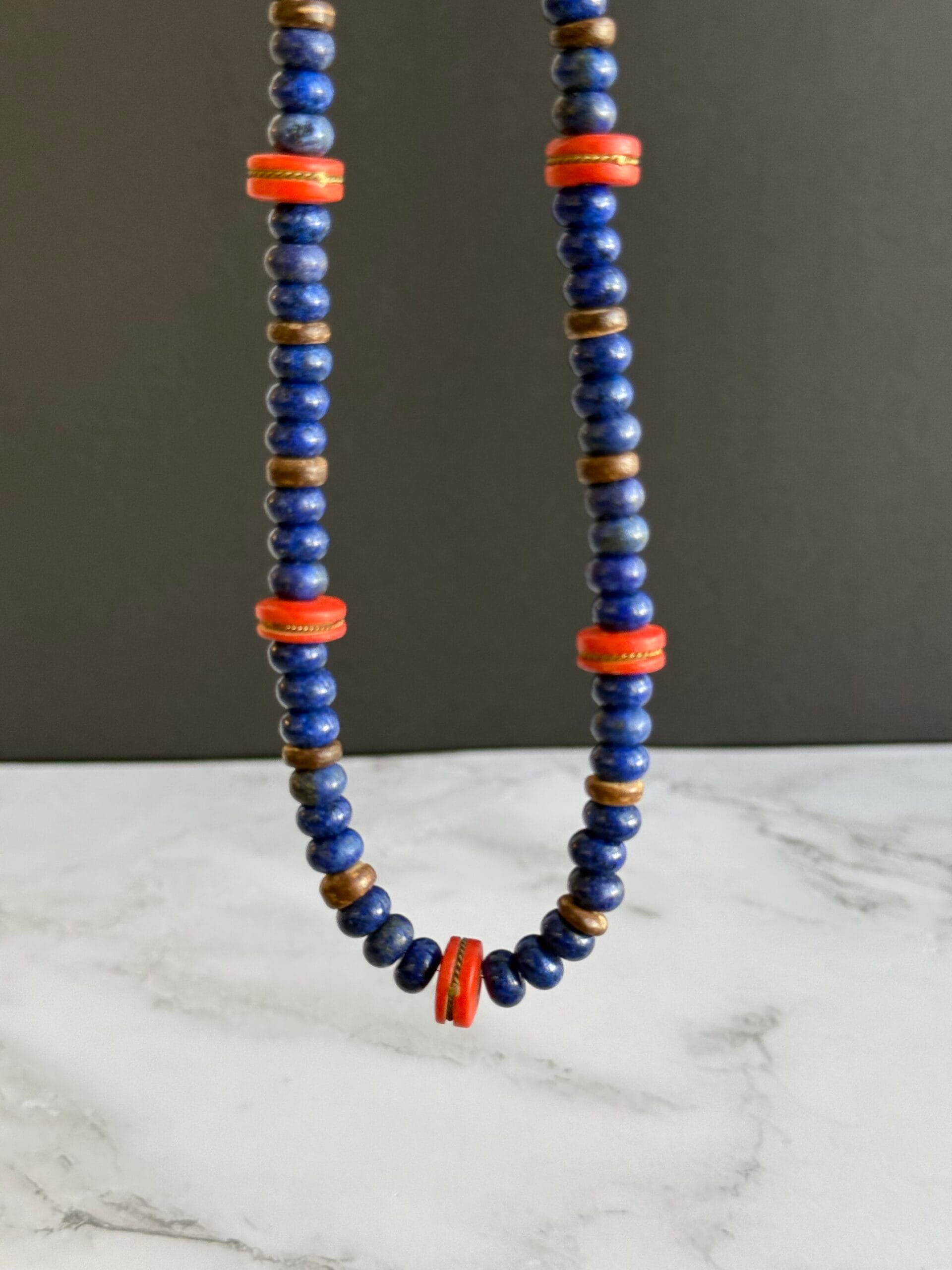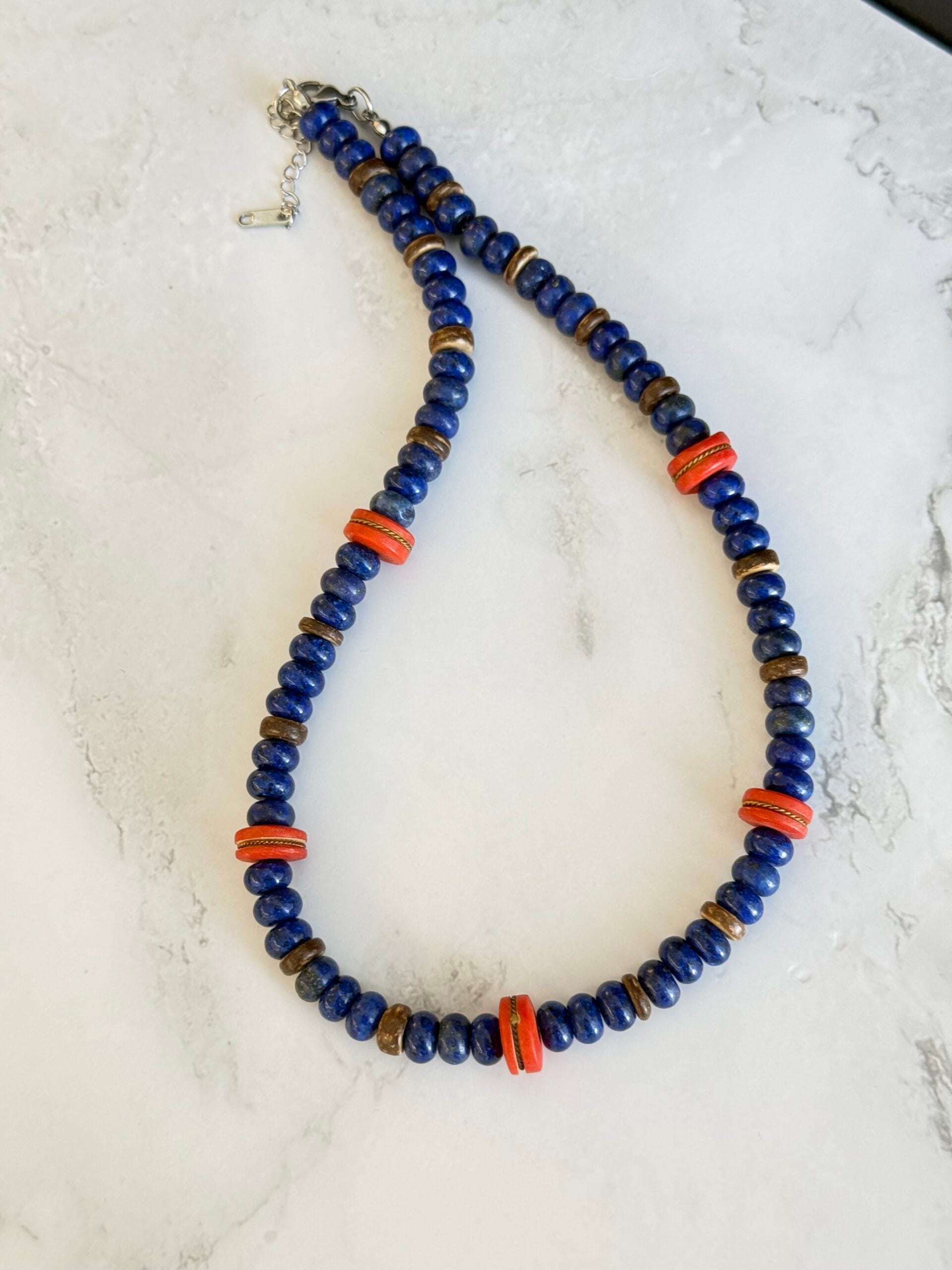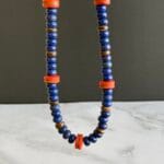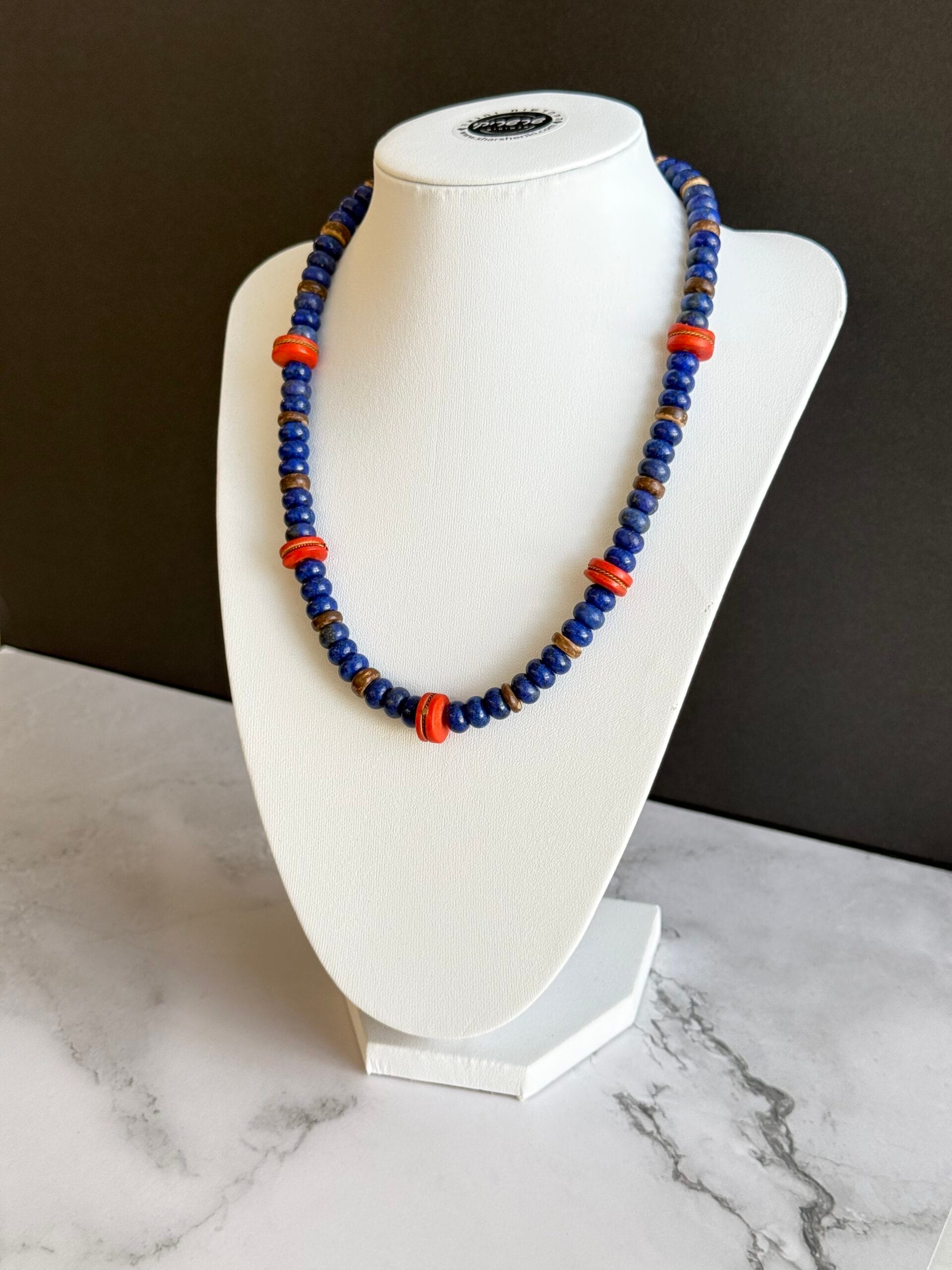 שרשרת בגווני כחול ואדום עשויה מאבני חן לפיס לזולי וחרוזים אדומים מעוטרים בעבודת יד .