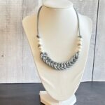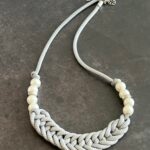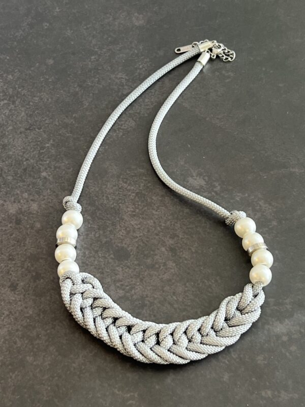 שרשרת קשר מקרמה מיוחדת עם אמירה עשויה חוט אפור ושזורה חרוזי פנינים מלאכותיות.