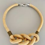 שרשרת מקרמה חלה עשויה מחבל קלוע בגוון חיטה בשילוב אלמנטים ממתכת בגוון ברונזה.