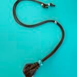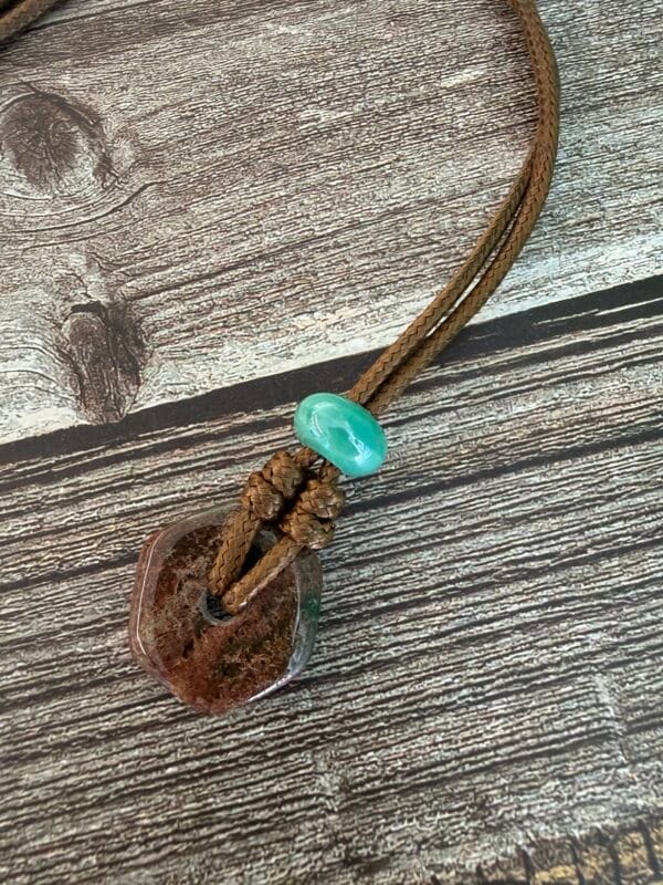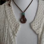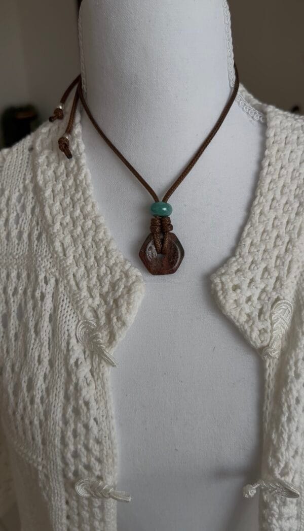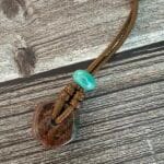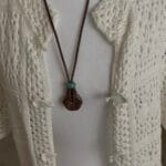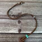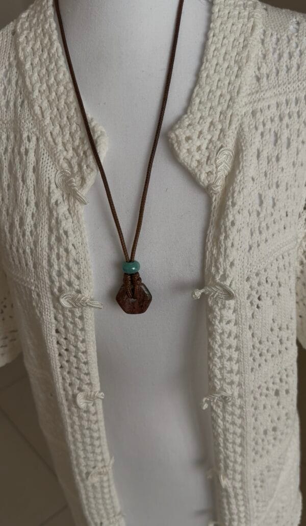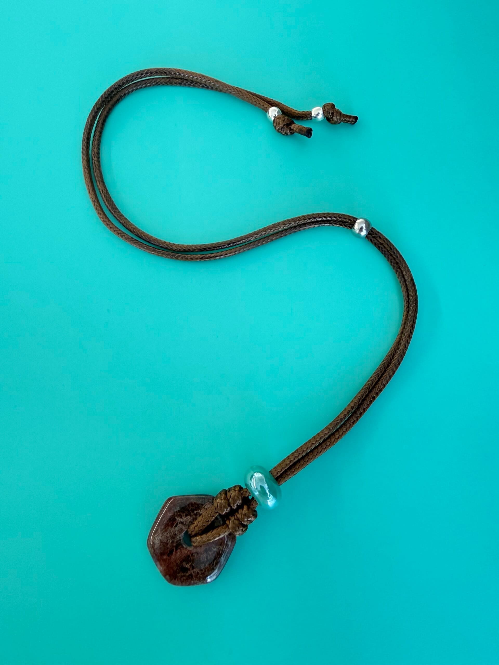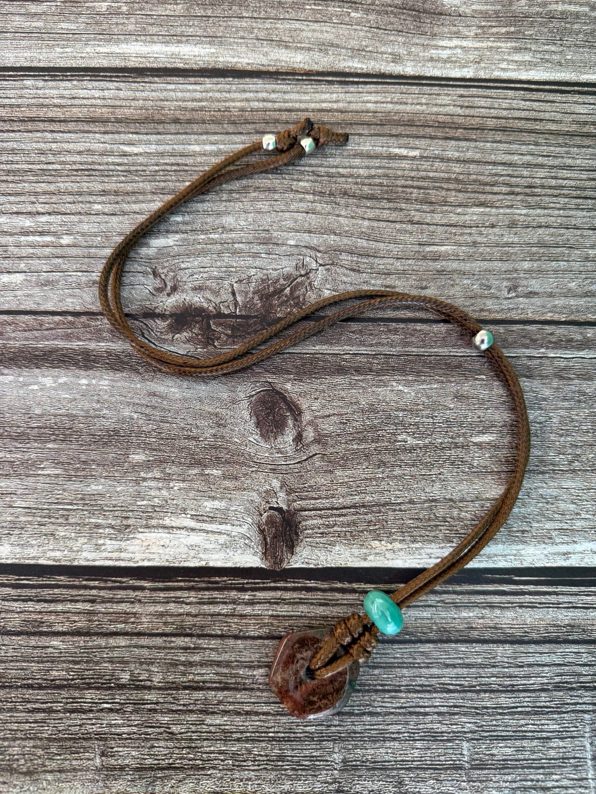 שרשרת חבל מתכווננת וכייפית, עשויה חבל חום ועליו תליון אבן ג’אספר בגוון חום בשילוב חרוז קרמיקה בטורקיז.