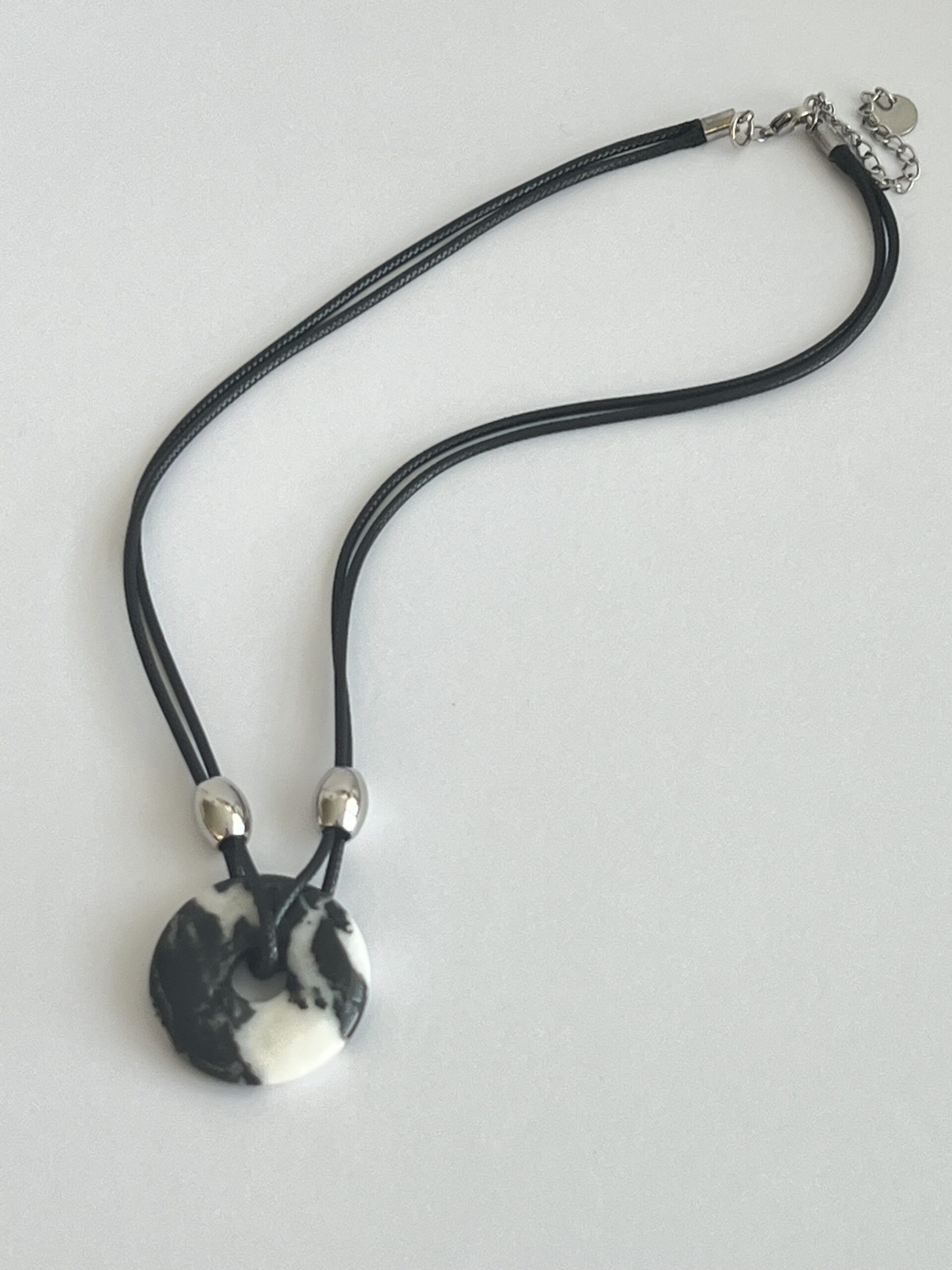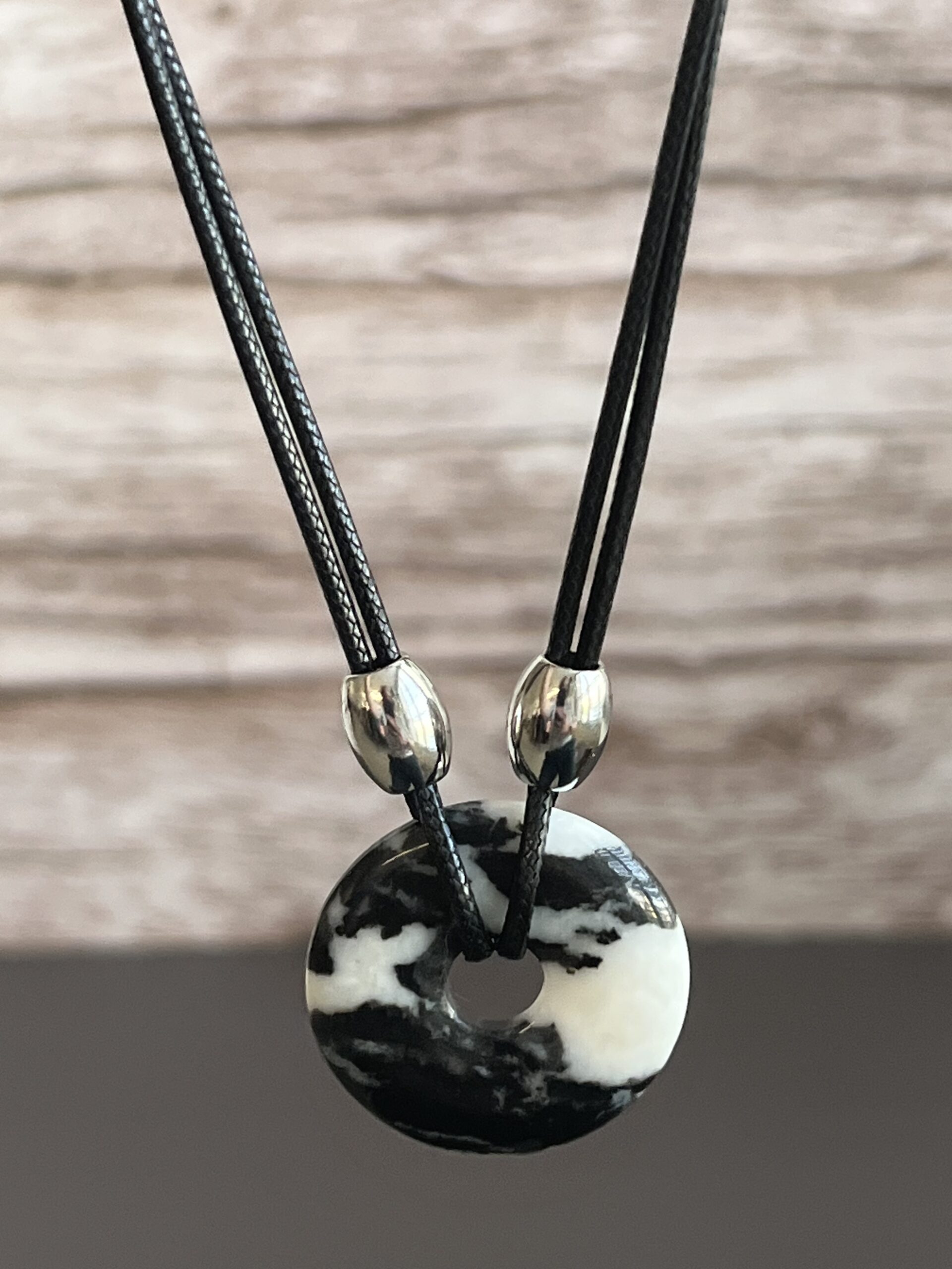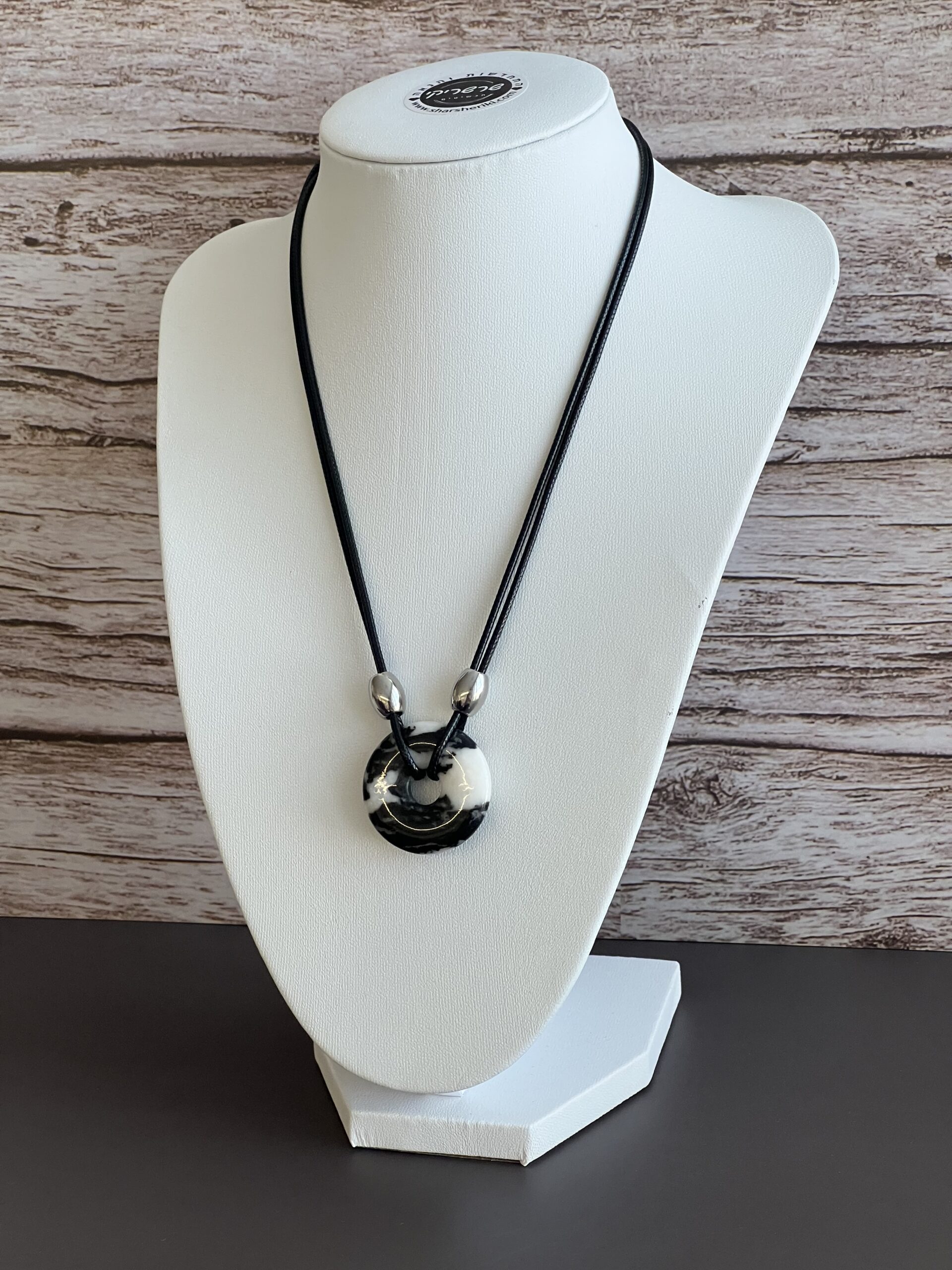שרשרת עשויה רצועות עור מעוטרות בחרוזים כסופים מבריקים ותליון דיסקית , אבן ג׳אספר זברה, היא אבן שמסמלת איזון, חיבור לאדמה ואנרגיה של שמחה.