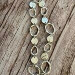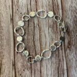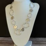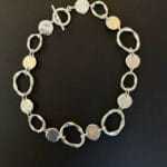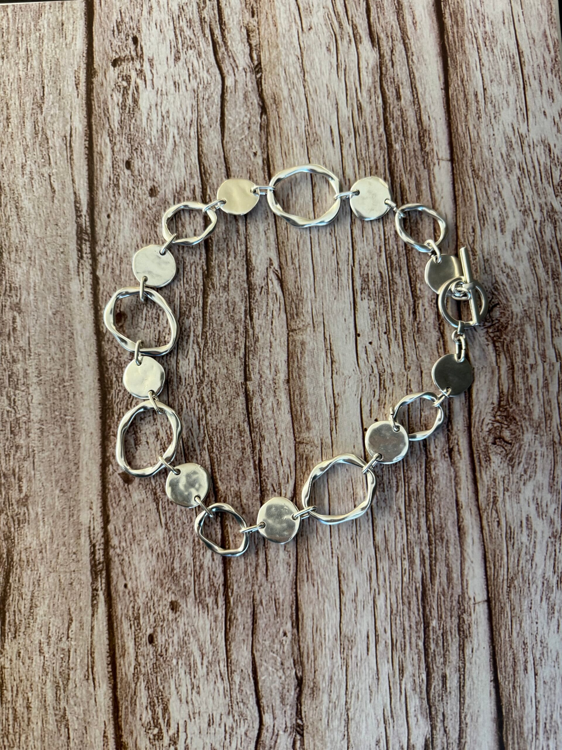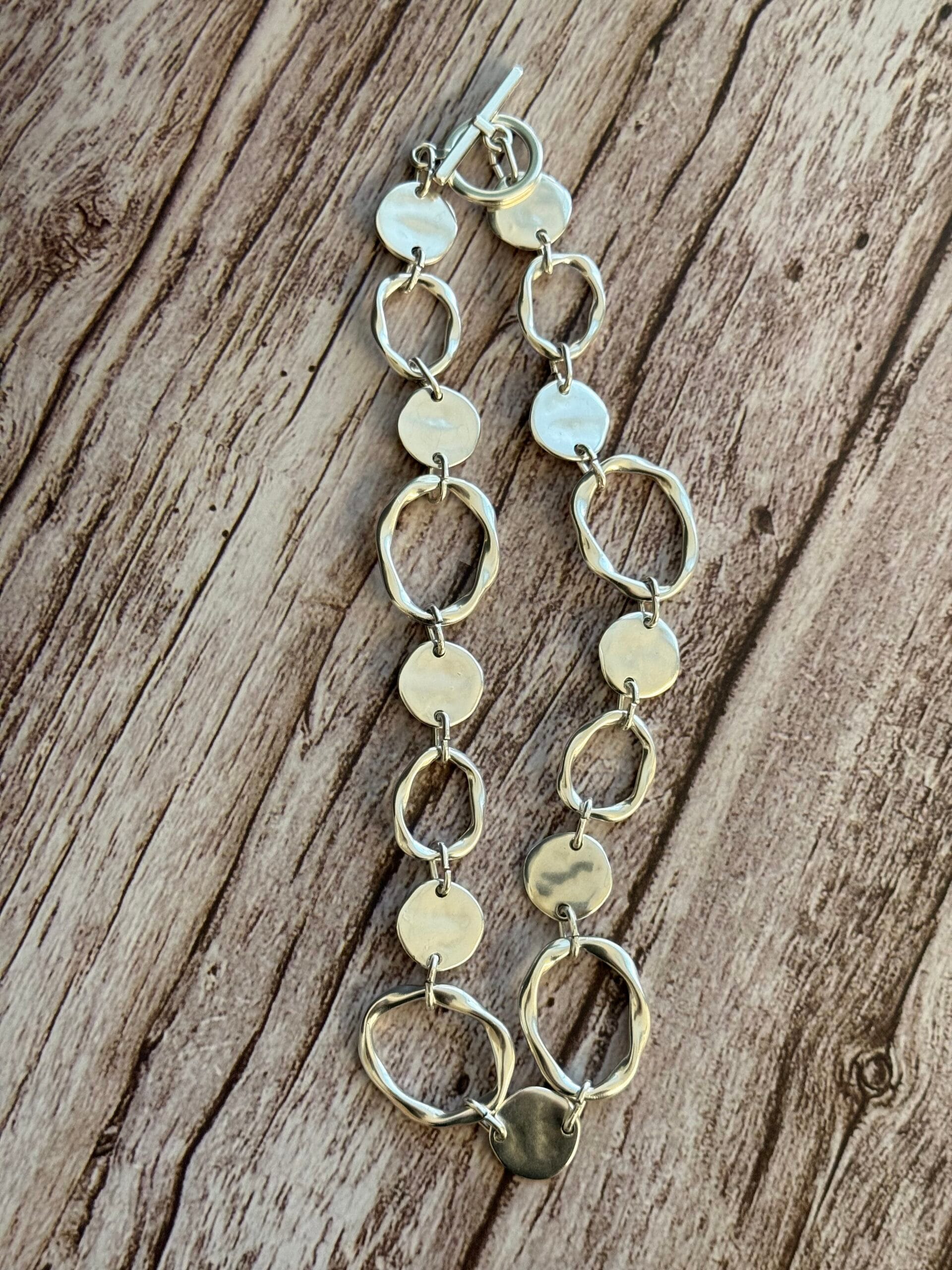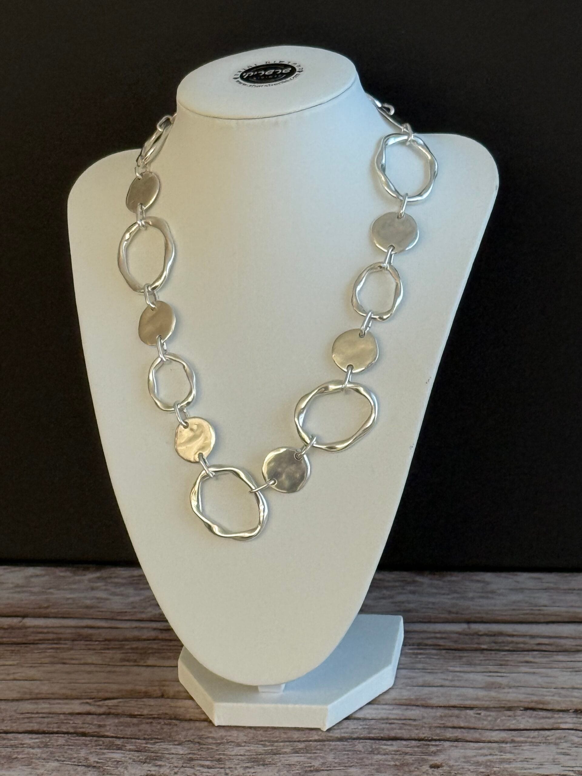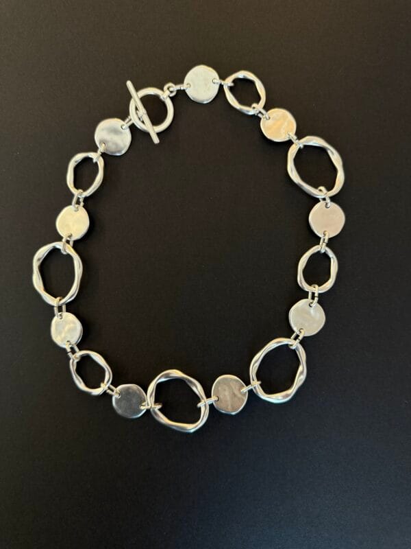 השרשרת מעוצבת, המשלבת חוליות אובליות במראה "גלי" וגולמי יחד עם דסקיות כסף עגולות וחלקות. הניגודיות בין הצורות יוצרת פריט בעל נוכחות מרשימה אך קלילה, שמתאים לערב ולבוקר כאחד.