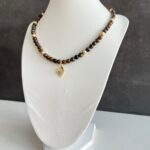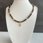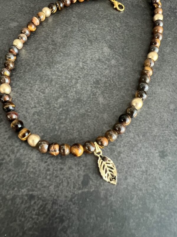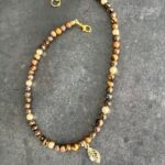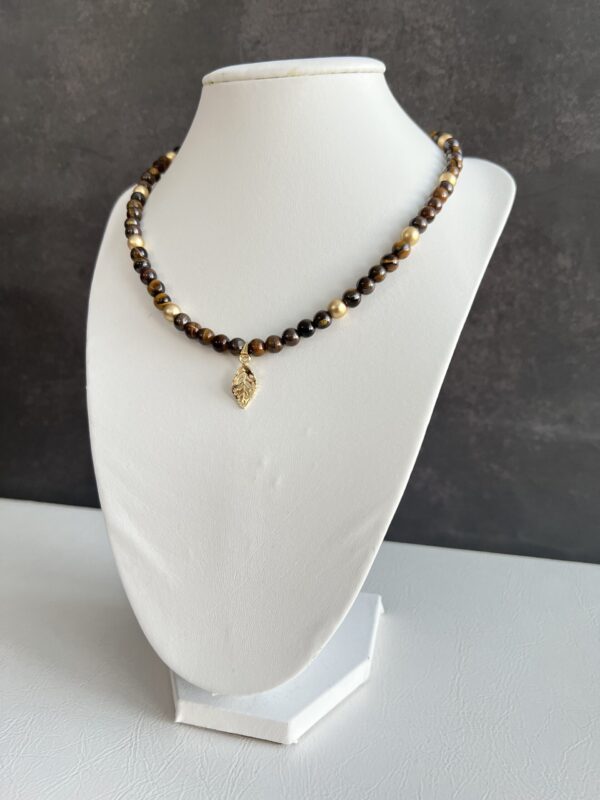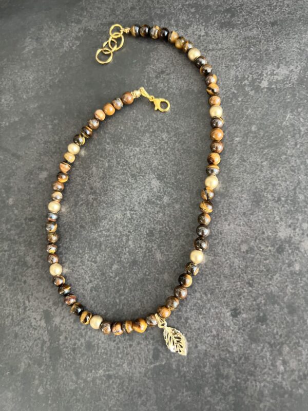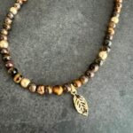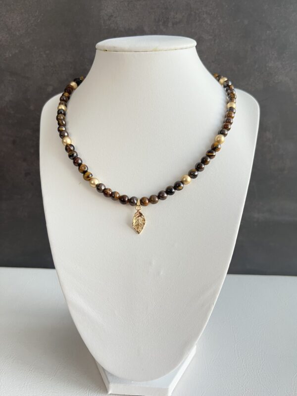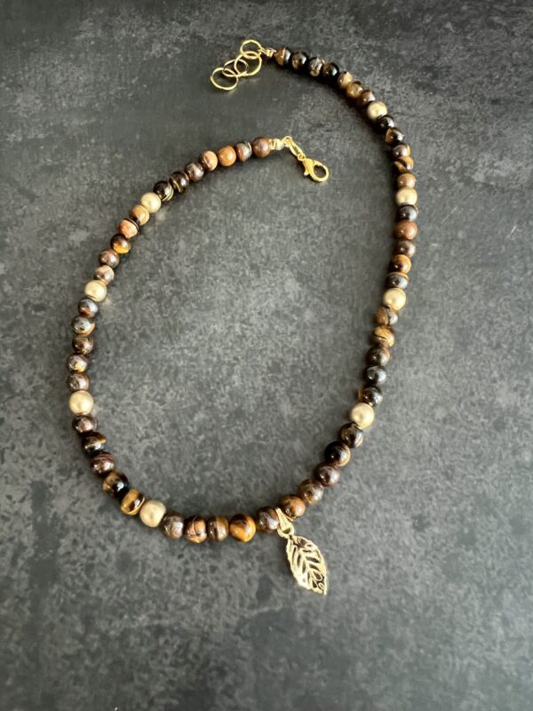 שרשרת חרוזי עין הנמר בשילוב חרוזי המטייט מוזהבים עם תליון עלה מוזהב.