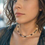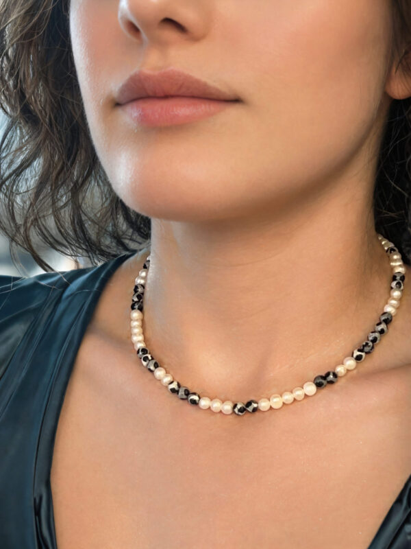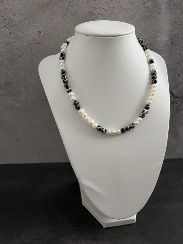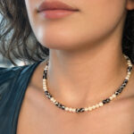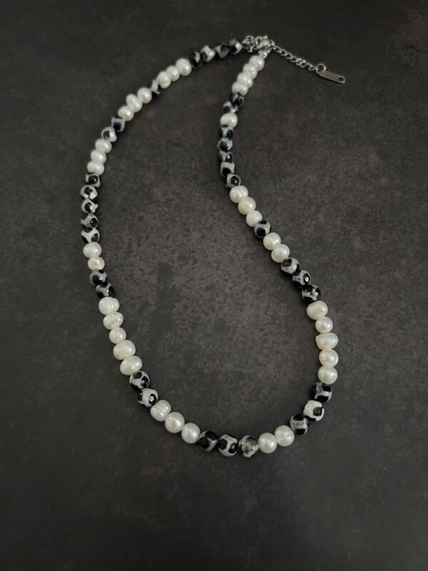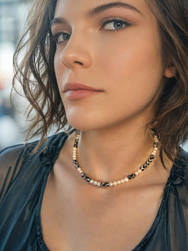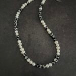 שרשרת ייחודית שמשלבת בין עדינות הפנינים הקלאסיות לבין הנוכחות המרשימה של אבני ג׳אספר מנומרות בשחור-לבן. השילוב הבלתי צפוי בין האלמנטים יוצר תכשיט עם אמירה – אלגנטי אך שובב, קלאסי אך מודרני.