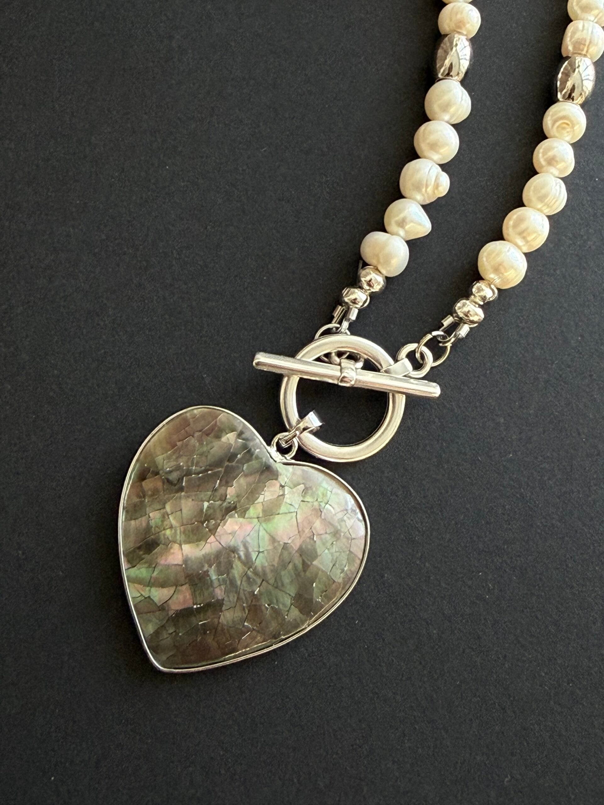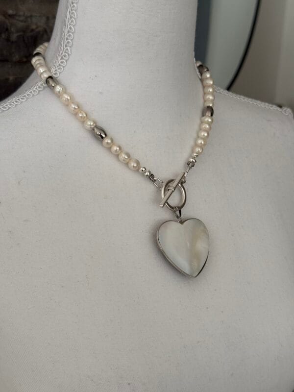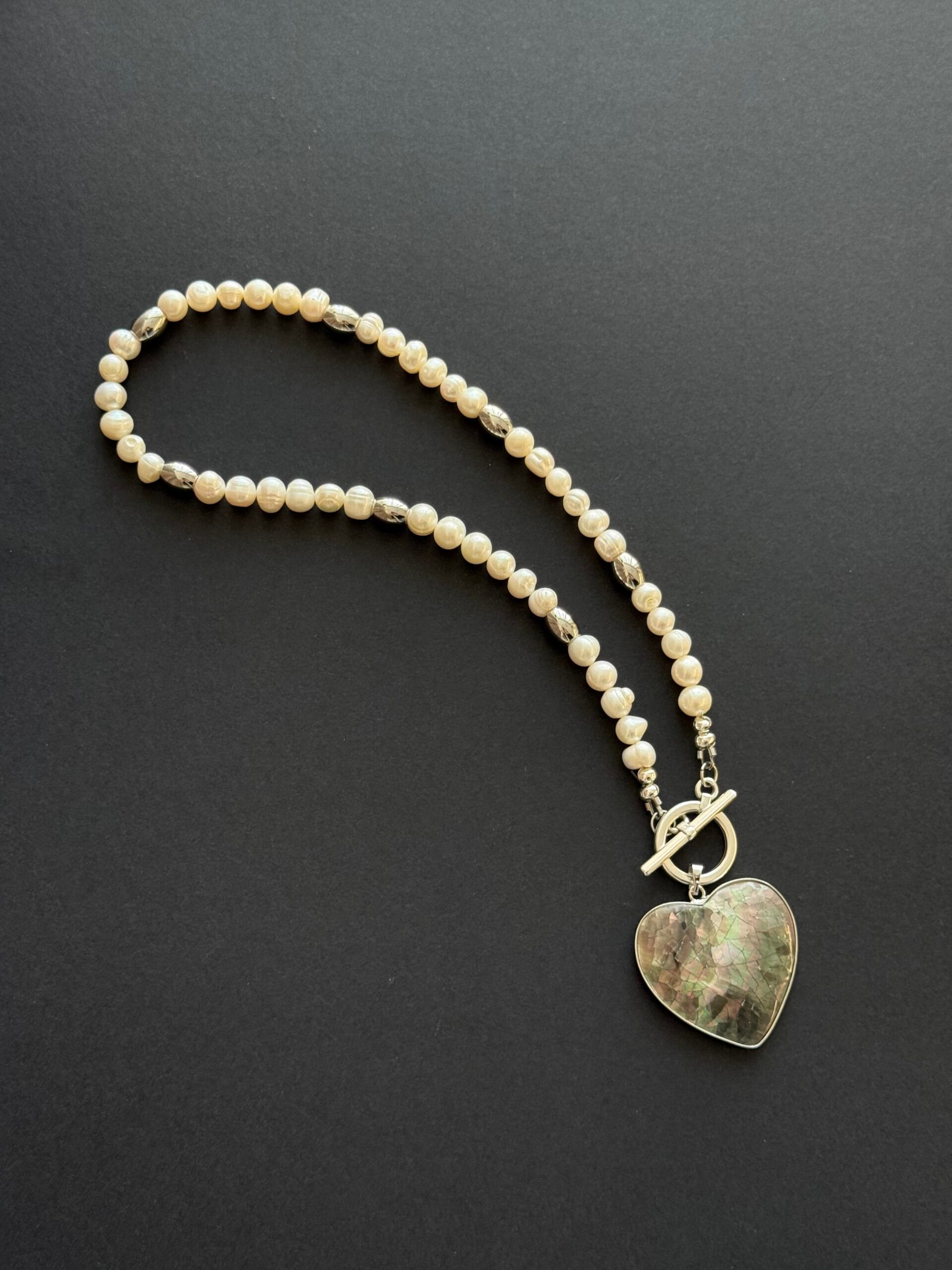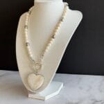 לשרשרת סוגר קדמי מצופה כסף נוח ומעוצב ותליון לב עשוי צדף דו צדדי: האחד בגוון פנינה והשני בגוון אפור בטקסטורת סדקים.