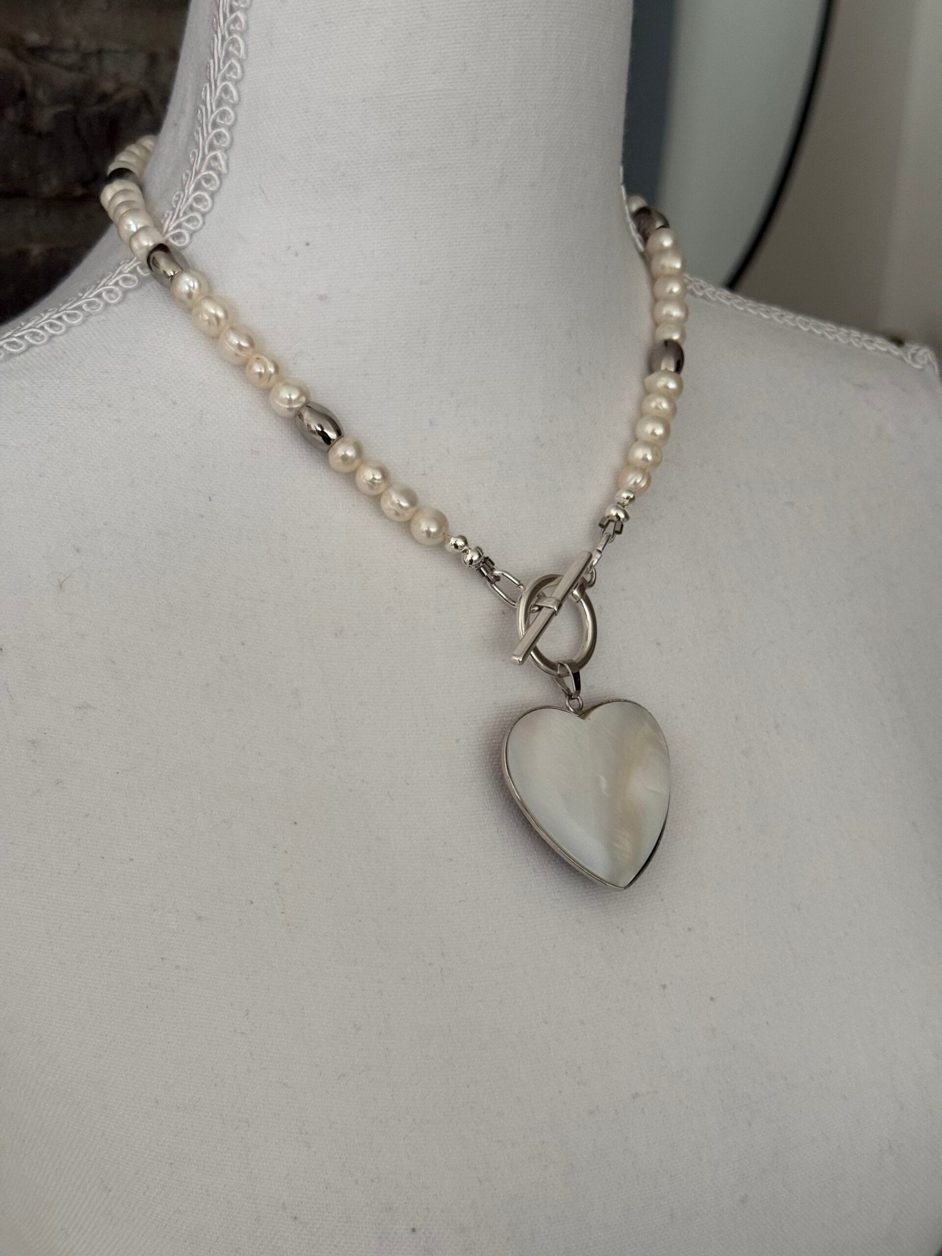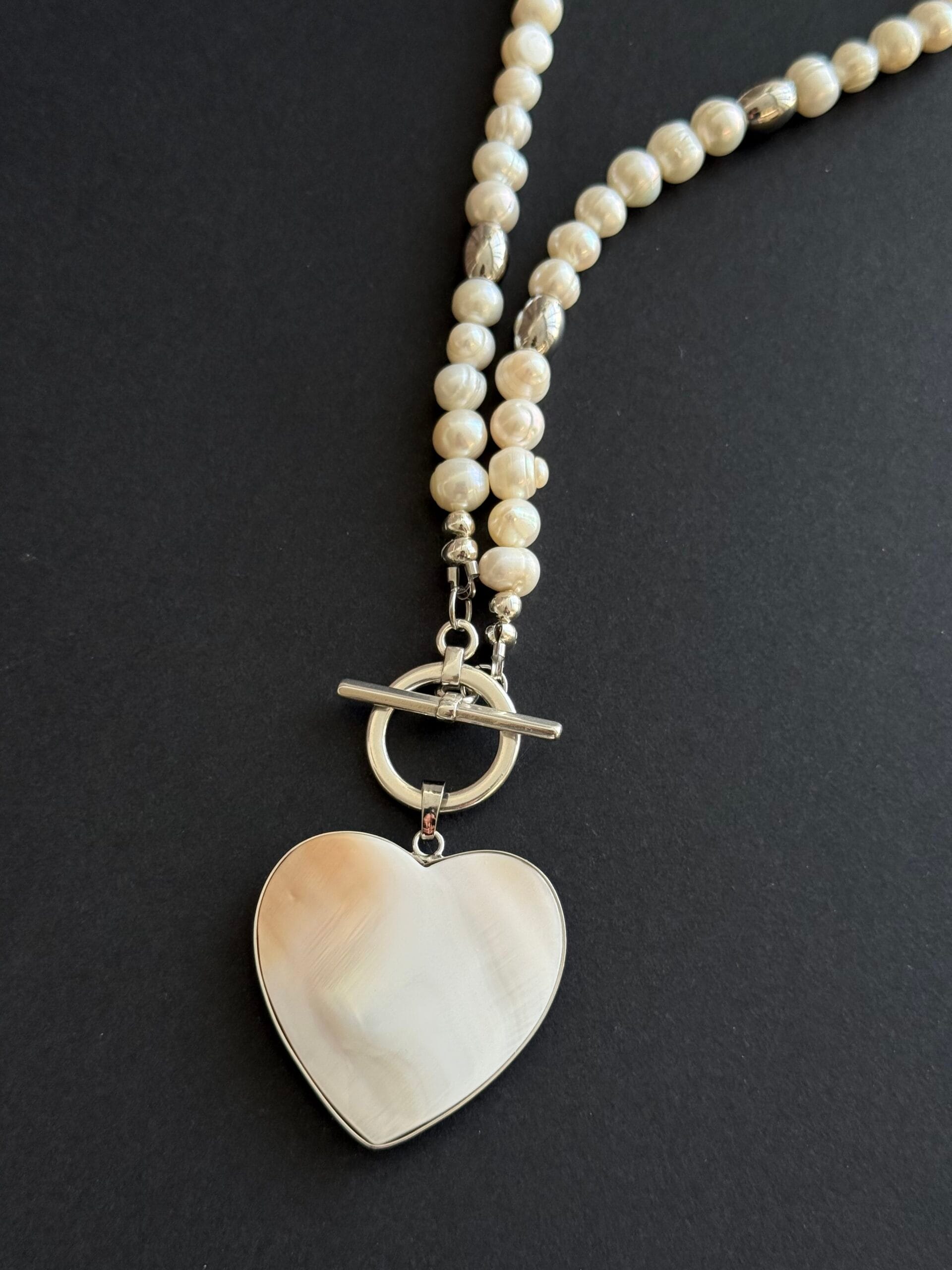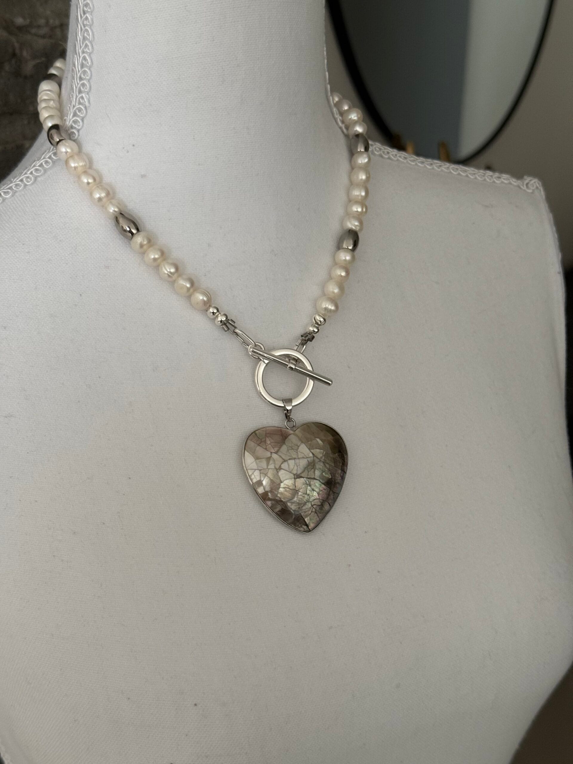 לשרשרת סוגר קדמי מצופה כסף נוח ומעוצב ותליון לב עשוי צדף דו צדדי: האחד בגוון פנינה והשני בגוון אפור בטקסטורת סדקים.