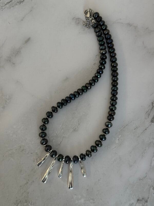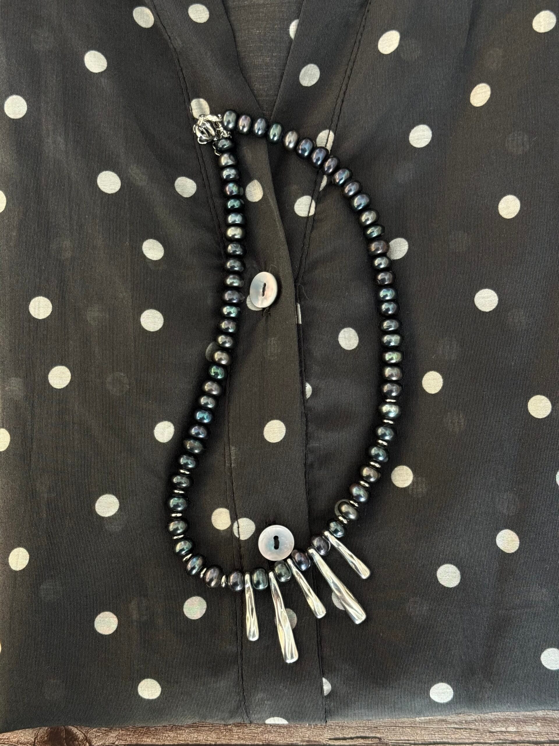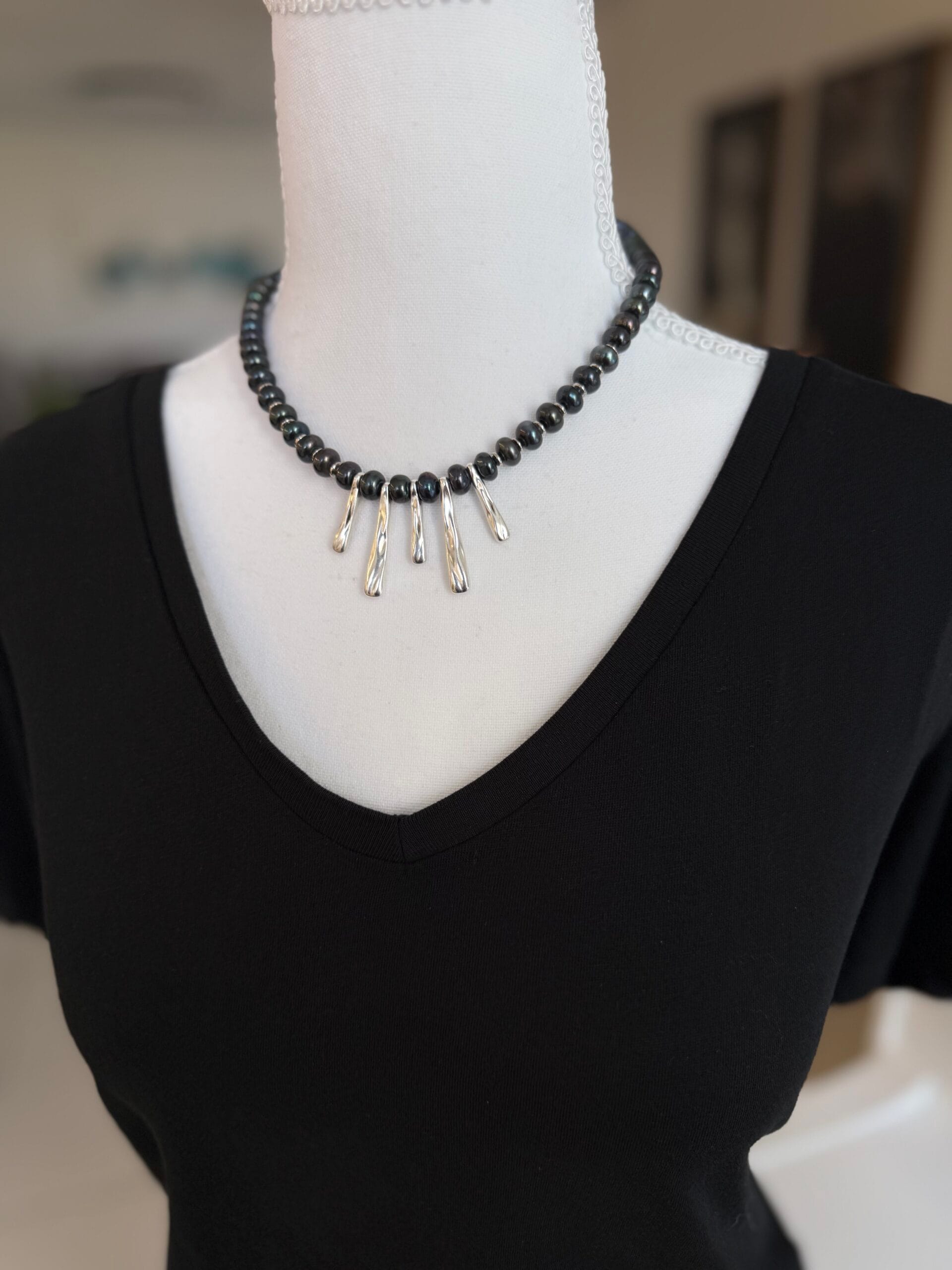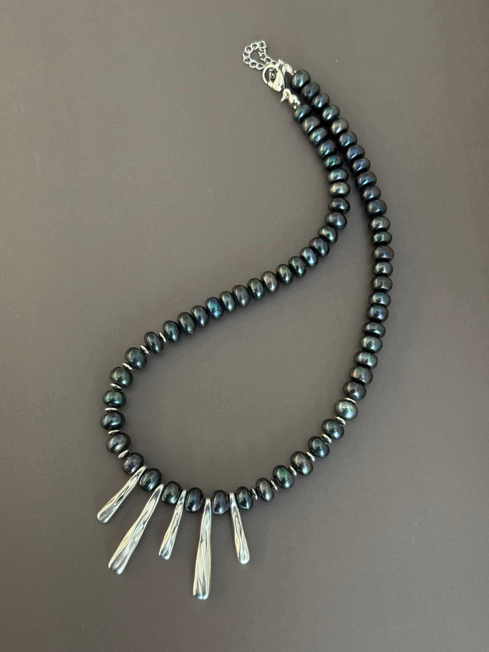 שרשרת פניני מים מתוקים שחורות מתורבתות, בשילוב חרוזי סטיינלסטיל כסופים ואלמנט מרכזי בציפוי כסף 999 מבריק ויוקרתי. השרשרת איכותית, בעלת נוכחות חזקה, משדרת יוקרה ומקוריות.