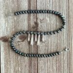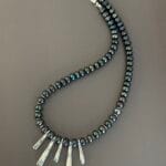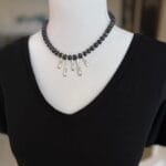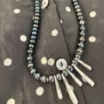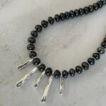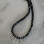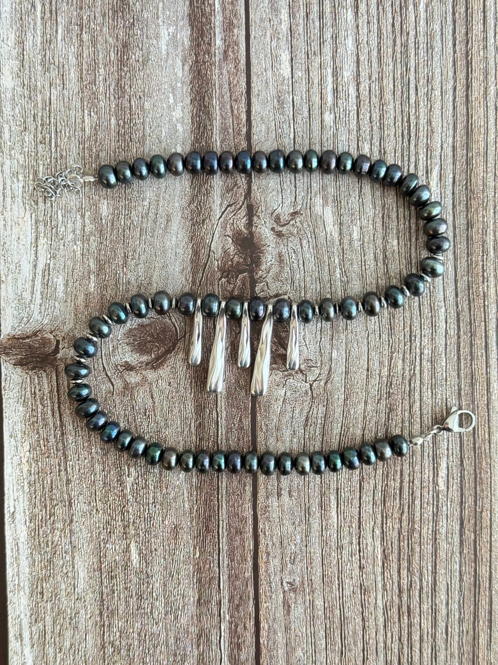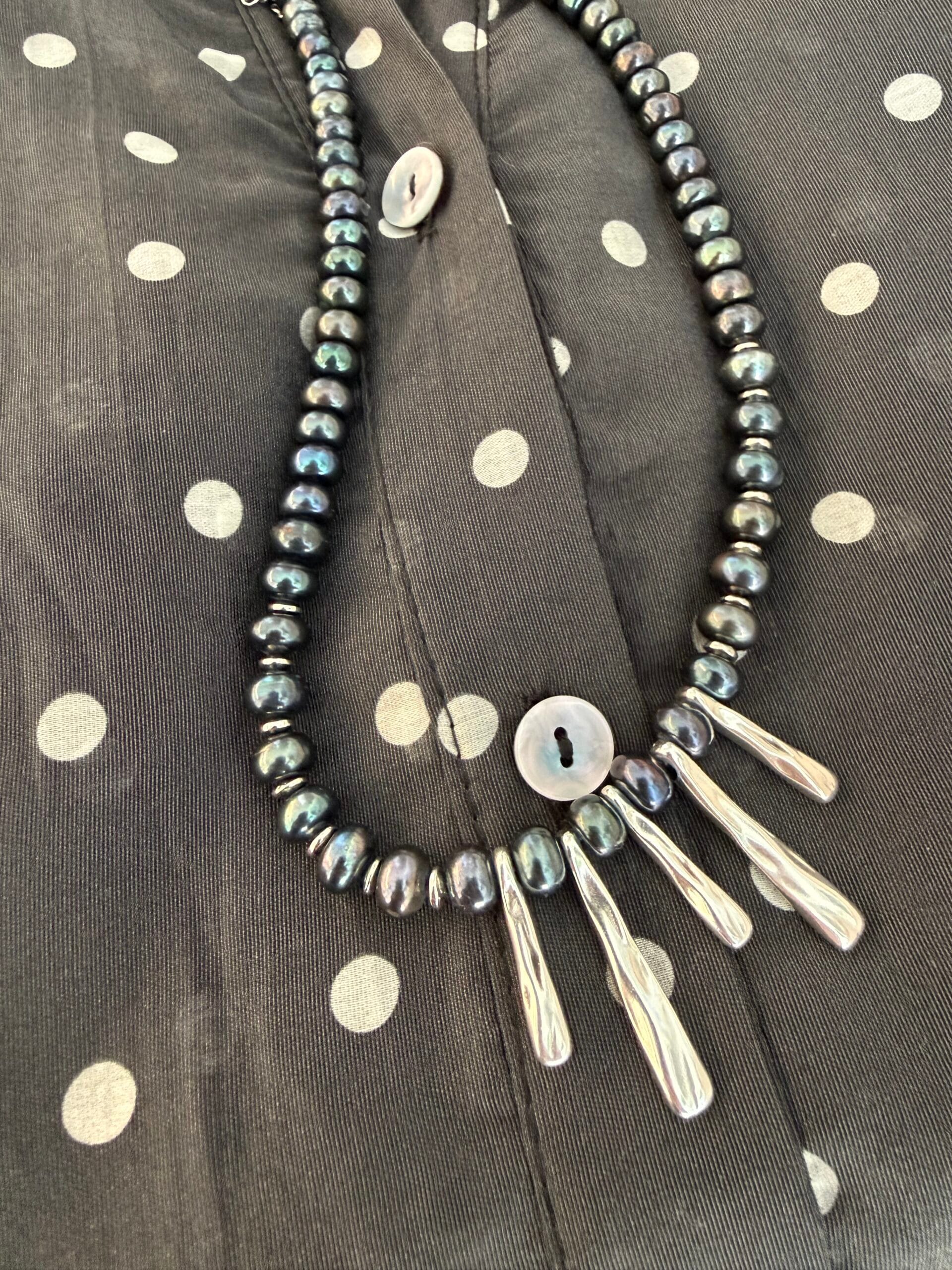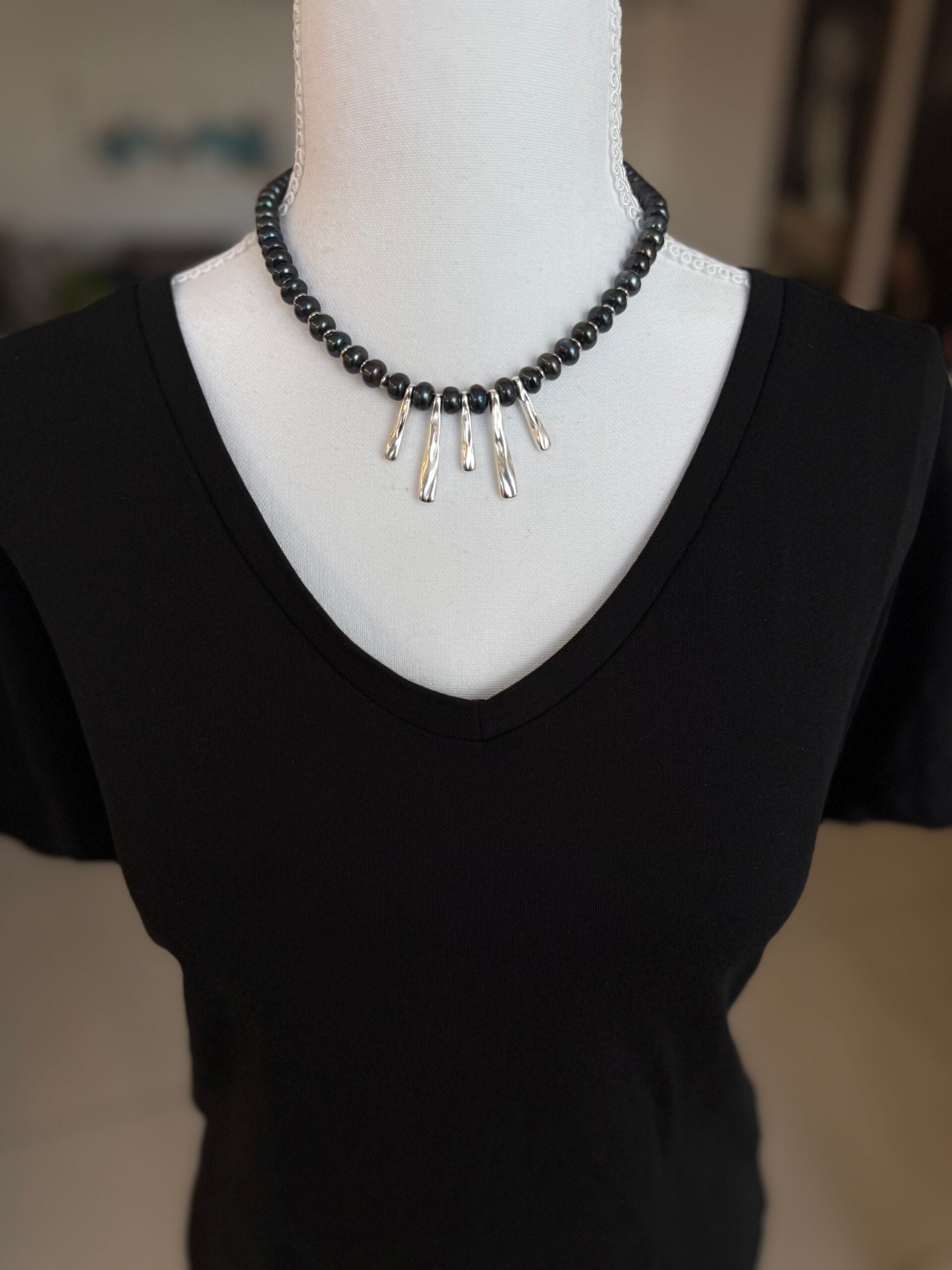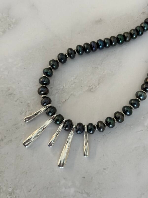 שרשרת פניני מים מתוקים שחורות מתורבתות, בשילוב חרוזי סטיינלסטיל כסופים ואלמנט מרכזי בציפוי כסף 999 מבריק ויוקרתי. השרשרת איכותית, בעלת נוכחות חזקה, משדרת יוקרה ומקוריות.