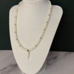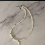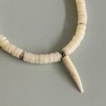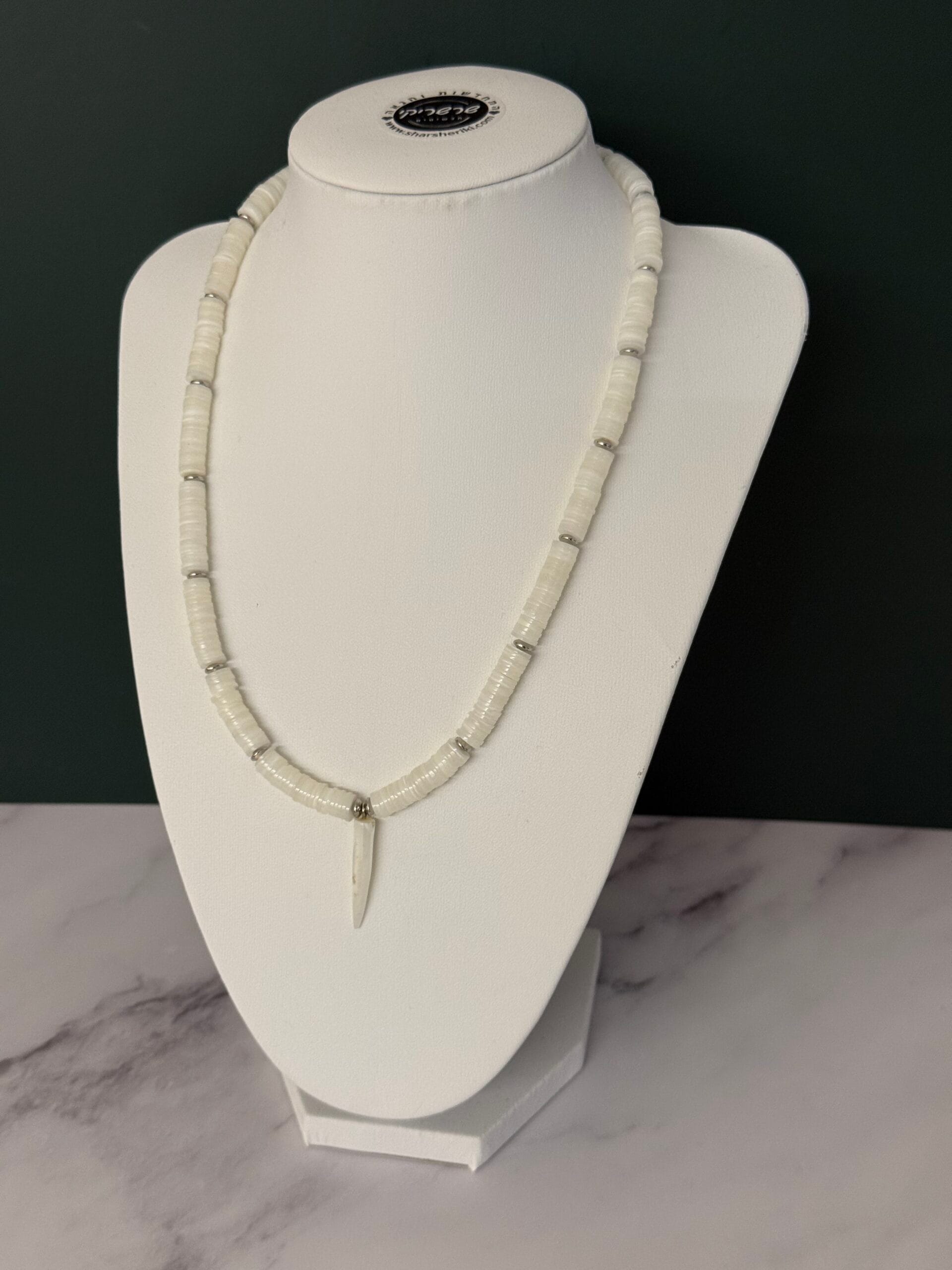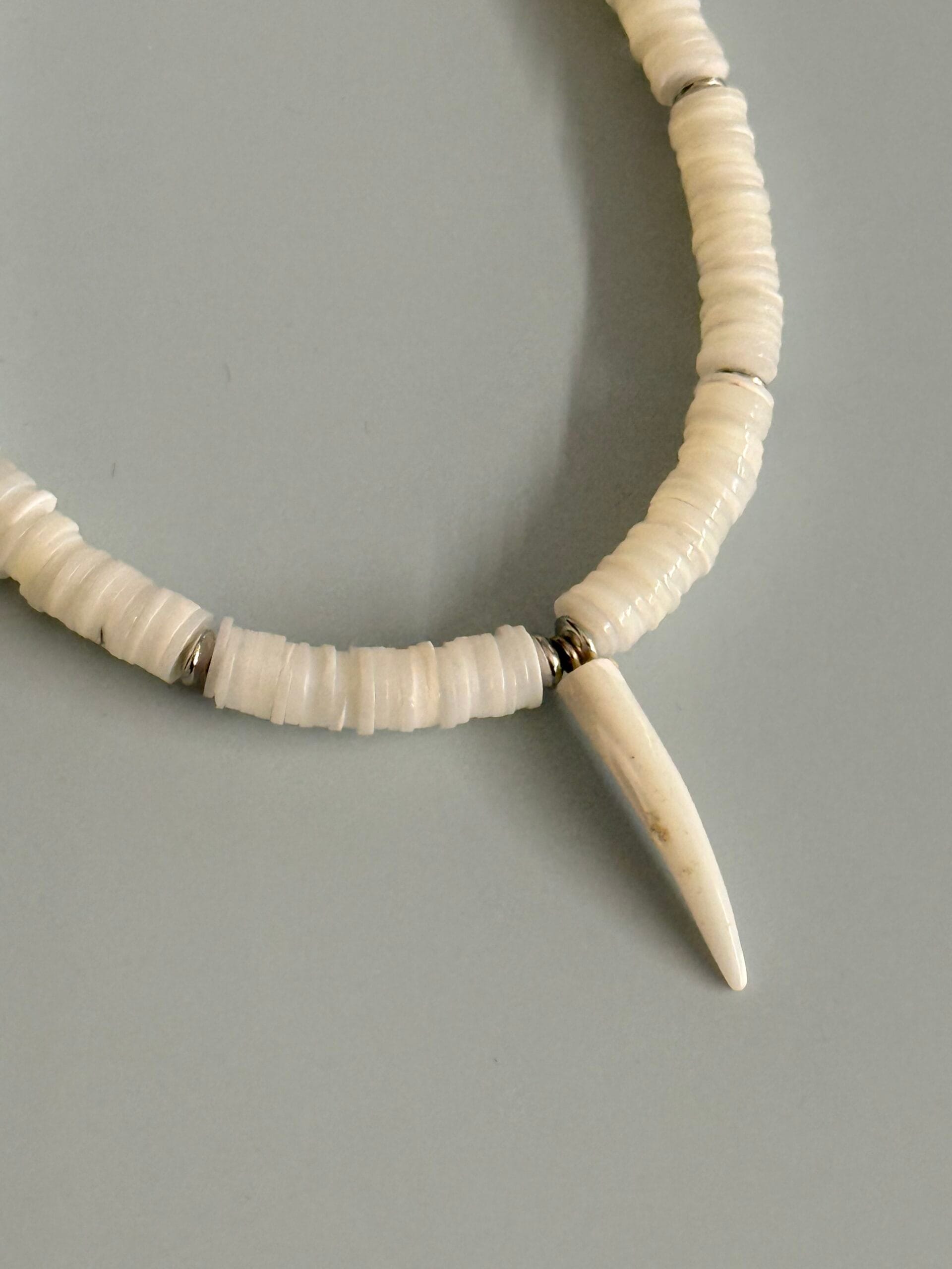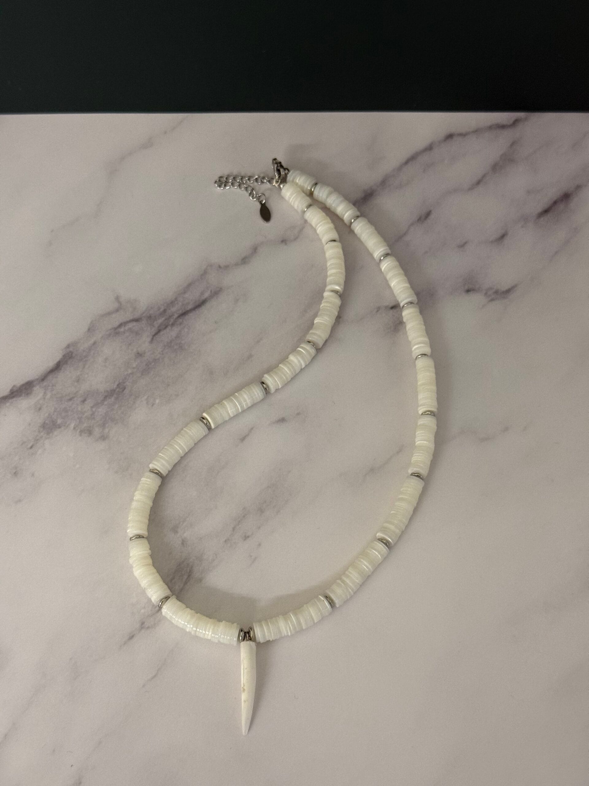 שרשרת מהטבע שחיה חרוזי צדף לבנים ותליון ניב עשוי גם הוא צדף, השרשרת קייצית ומאירת עיניים.