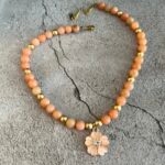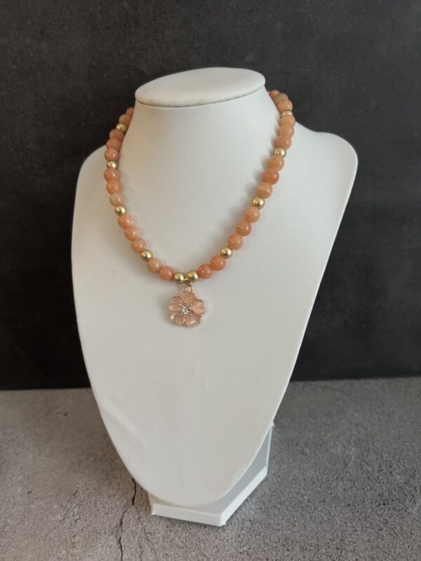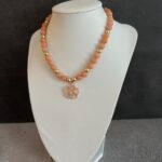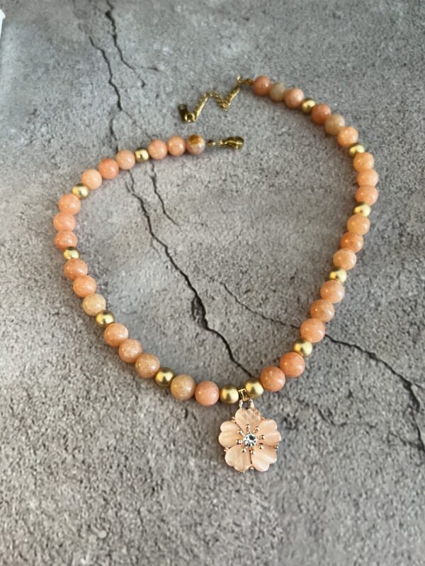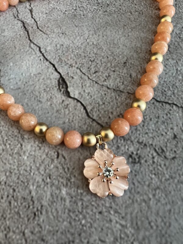 מחרוזת צ'וקר עשויה מאבני חן בגוון אפרסק בשילוב חרוזים מוזהבים ותליון פרח בגוון תואם.