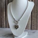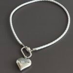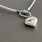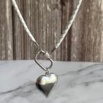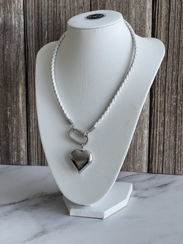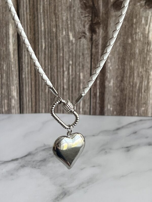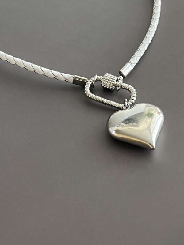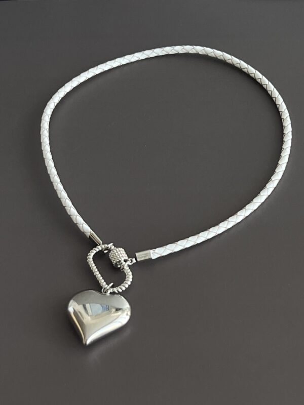 שרשרת עור צמה מינימליסטית בלבן עם סוגר קדמי קרבינה כסופה נוחה לשימוש ותליון לב כסוף.