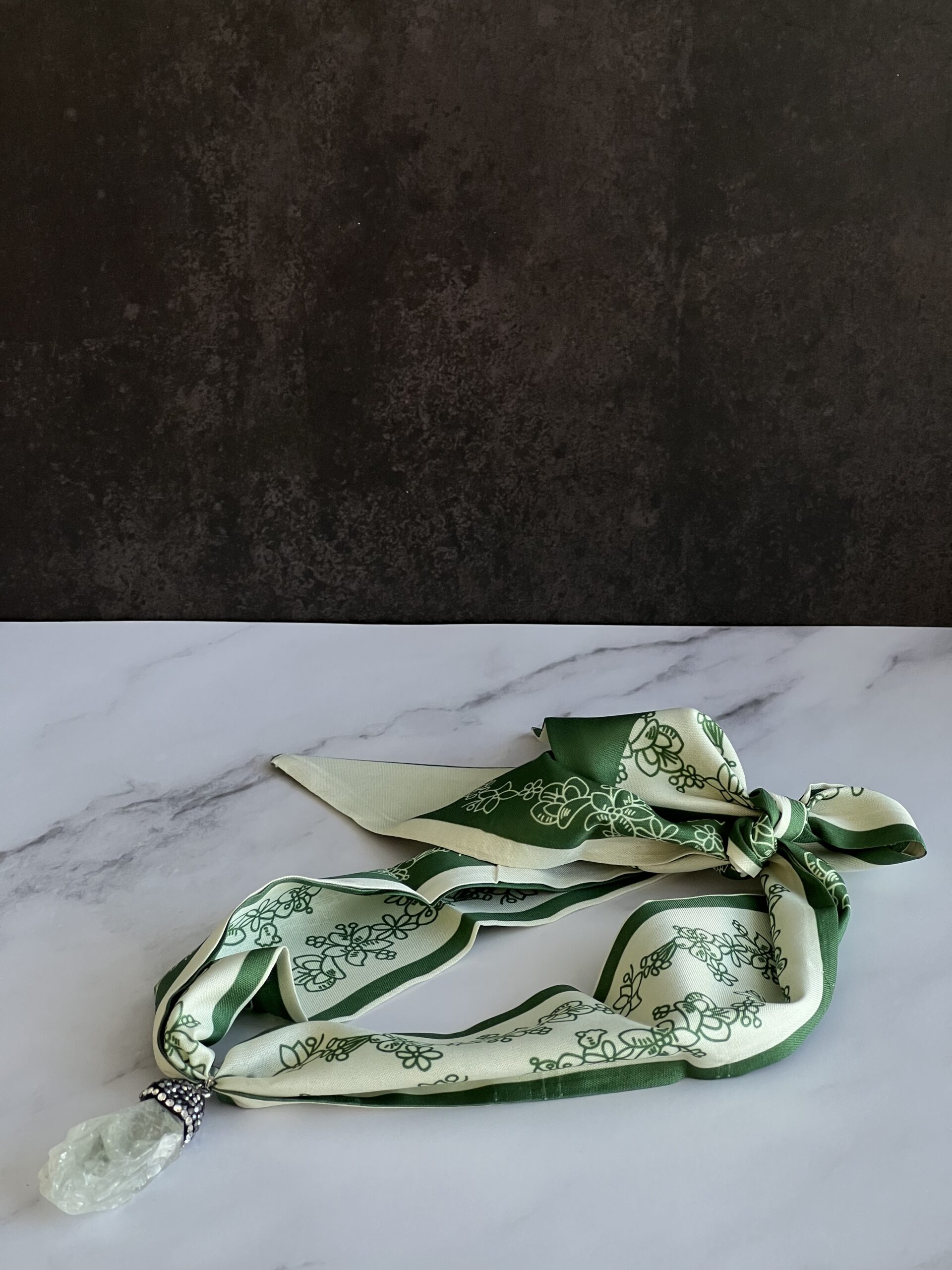 הכירי את הטוויסט המושלם לצעיף הקלאסי, צעיף אלגנטי הנקשר מאחור, עם תליון אבן חן במרכז.