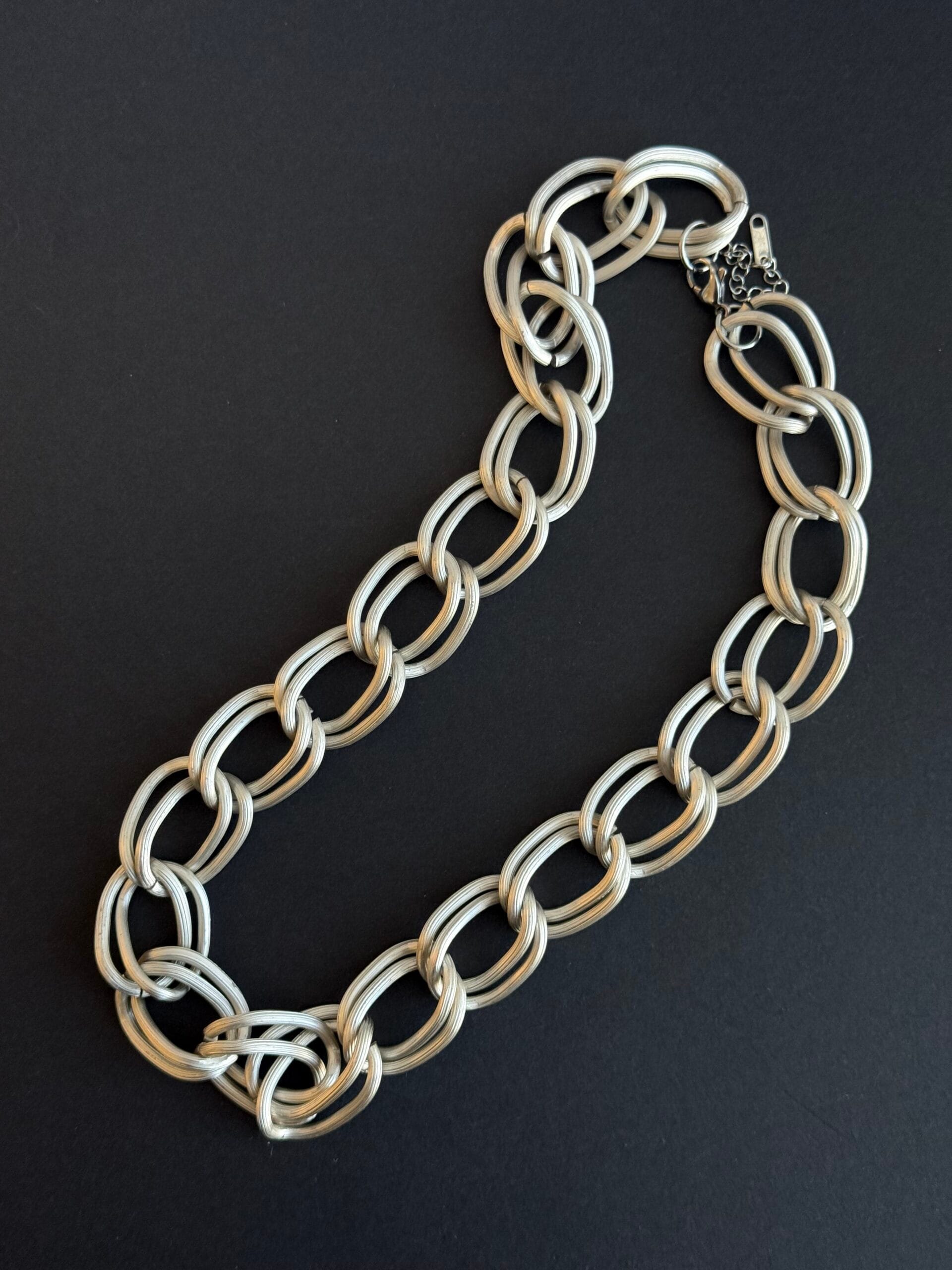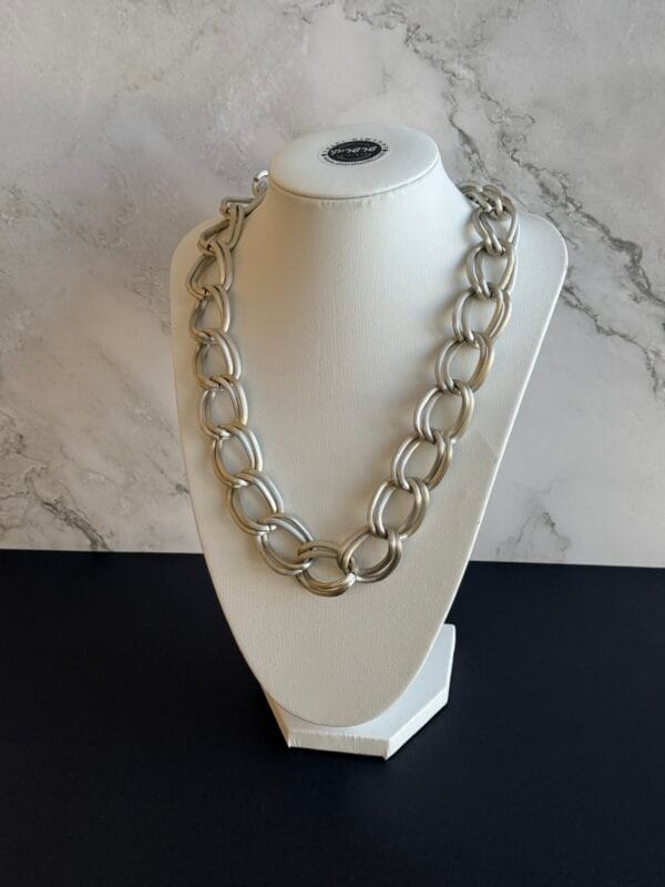שרשרת אלומיניום איכותית ועמידה בעלת לולאות גדולות בסגנון צ׳אנקי בכסף מט קלת משקל שתעניק לך נוכחות מעניינת.