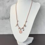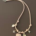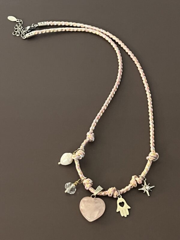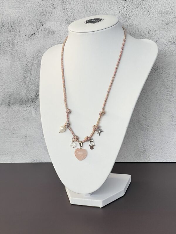 שרשרת עשויה חבל בגווני ורוד עם 5 צ׳ארמס : לב רוז קוורץ, חמסה, כוכב משובץ זירקון, פנינה מתורבתת, וחרוז קריסטל. שרשרת מלאת שיק מיוחדת וקלילה.