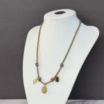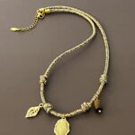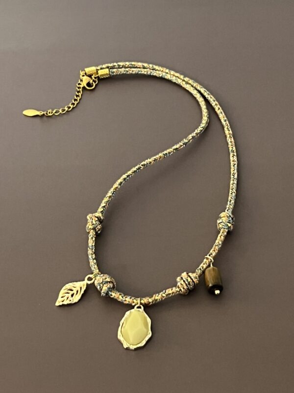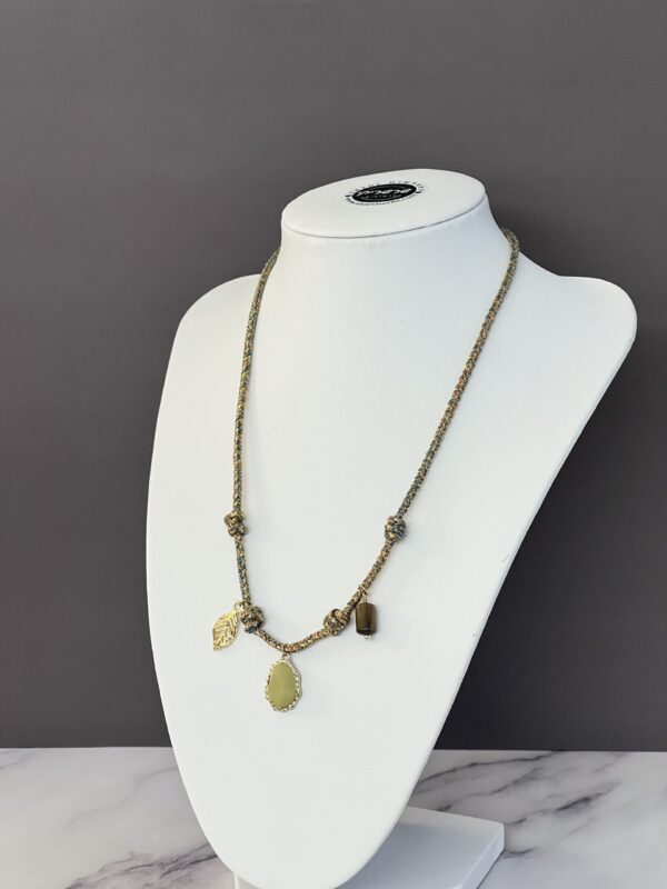 שרשרת עשויה חבל בגווני חום ירוק עם 3 צ׳ארמס : תליון מרכזי מוזהב משובץ אבן ירוקה, תליון אבן עין הנמר ותליון עלה מוזהב. שרשרת מלאת שיק מיוחדת וקלילה.