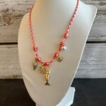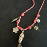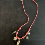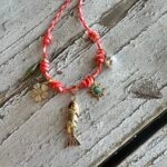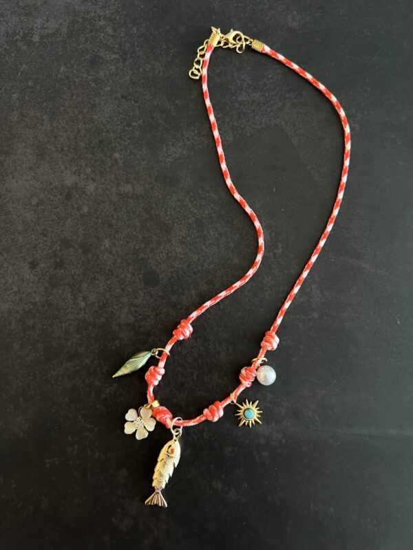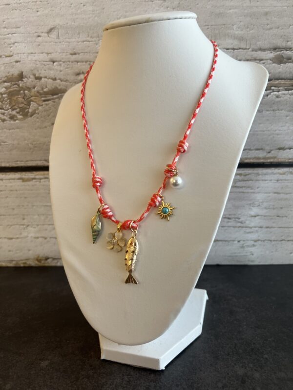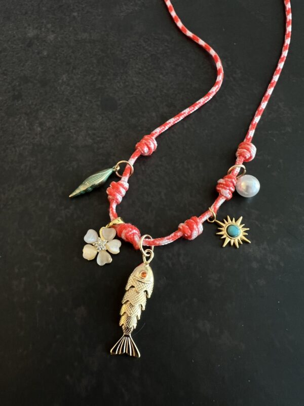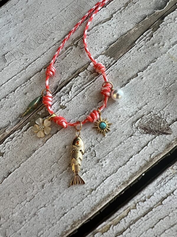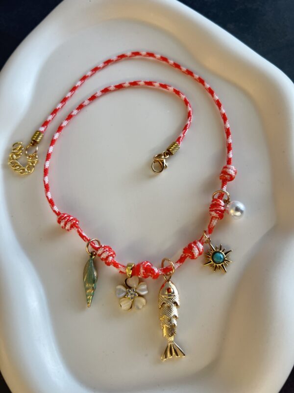 שרשרת עשויה חבל בגווני אדום ולבן עם 5 צ׳ארמס : פנינה, כוכב משובץ אבן טורקיז, דג הזהב, פרח וקונכיה.