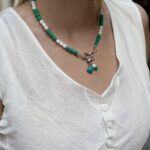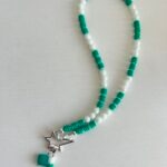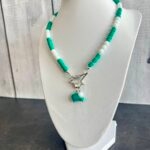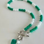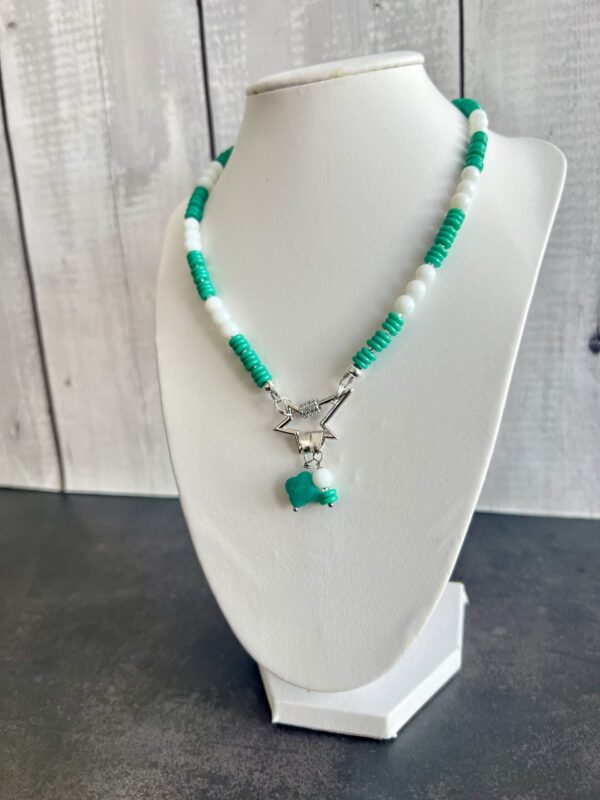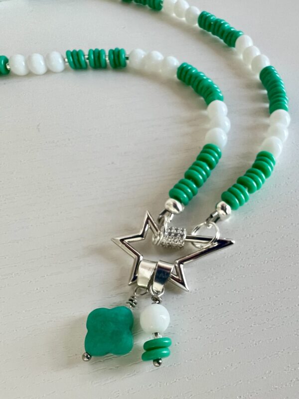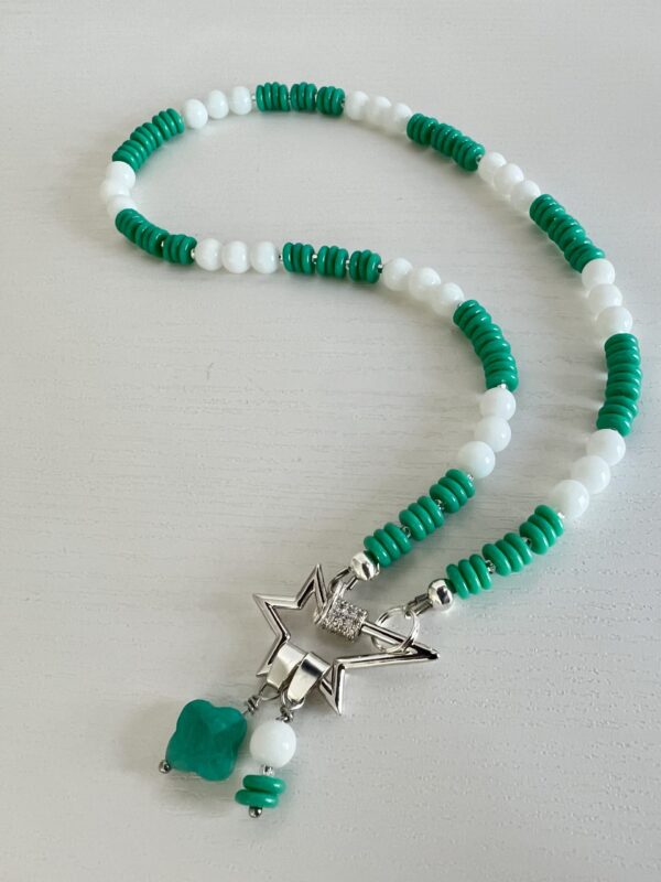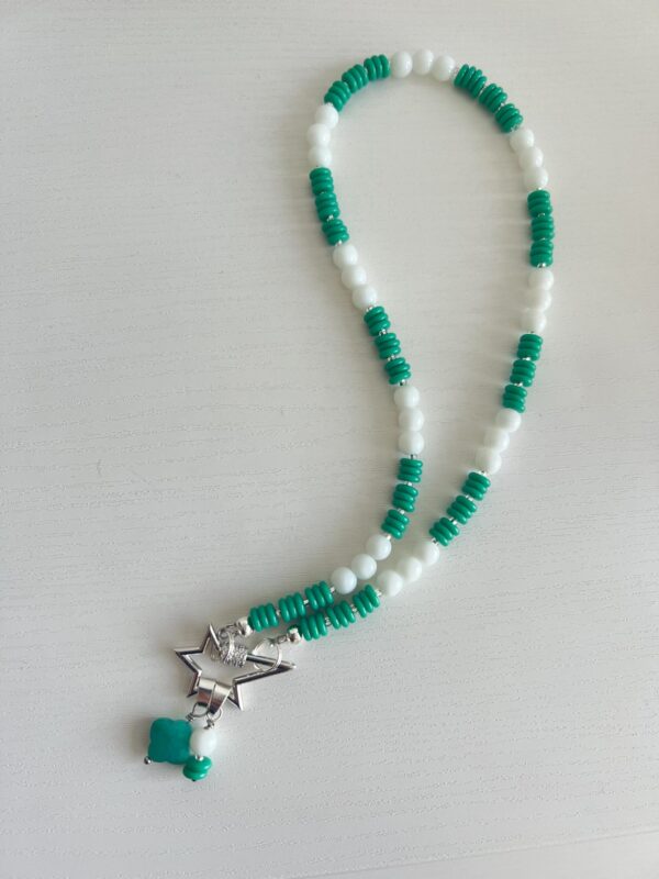 שרשרת בעיצוב ייחודי המשלבת חרוזי זכוכית לבנים וחרוזי דיסק בטורקיז עם סוגר קדמי כוכב כסוף משובץ זירקונים ותליון אמזונייט תלתן .