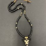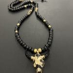 שרשרת מיוחדת במינה עשויה מחרוזי לפסטיק בשחור וחרוזי מתכת בזהב, במרכזה תליון שור זהב מעלף.