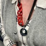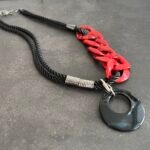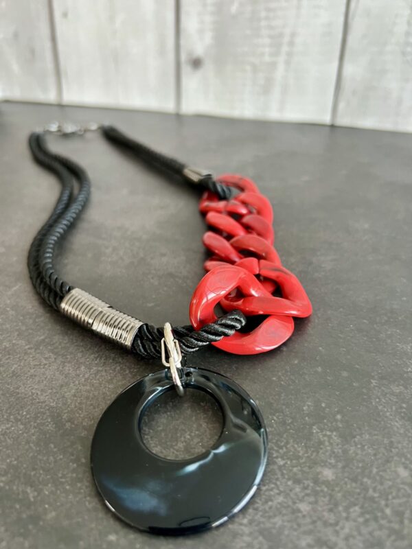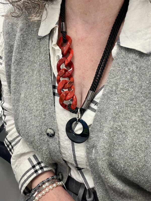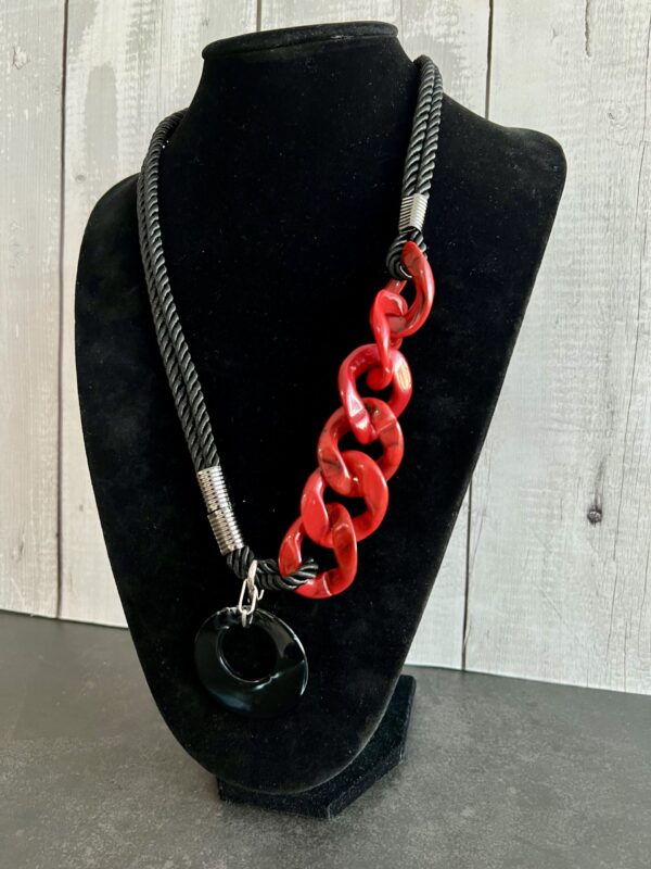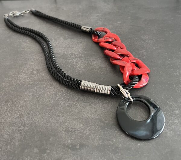 השרשרת משלבת חבל מלופף שחור ולולאות פלסטיק גדולות עם תליון לולאה שחור.