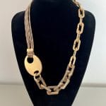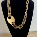 שרשרת לולאות מיוחדת מורכבת ממגוון חומרים ואלמנט מרכזי, שמשתלבים באופן מופלא בניהם. השרשרת ארוכה, בגווני חום זהב ושחור.