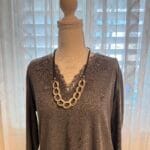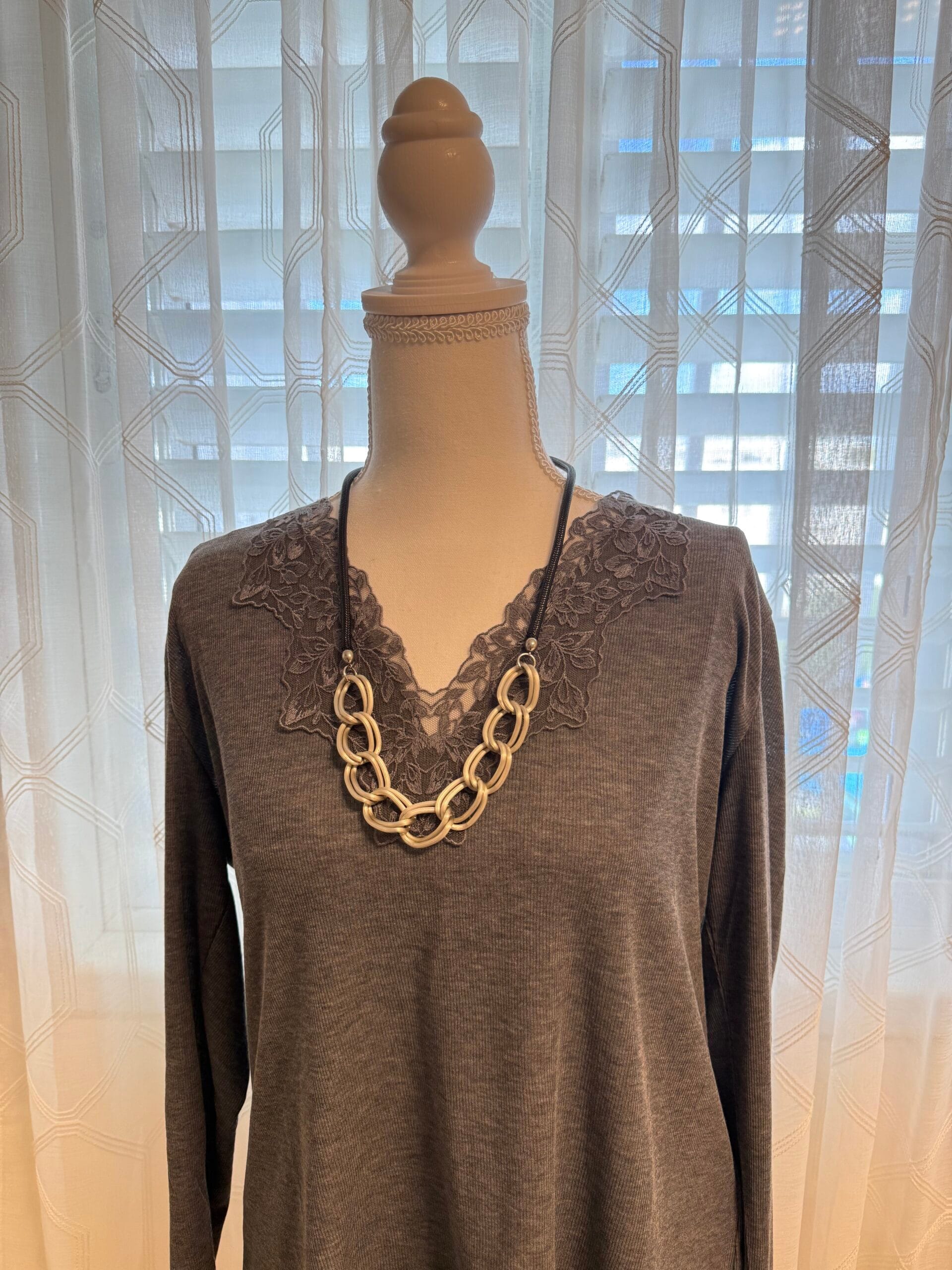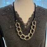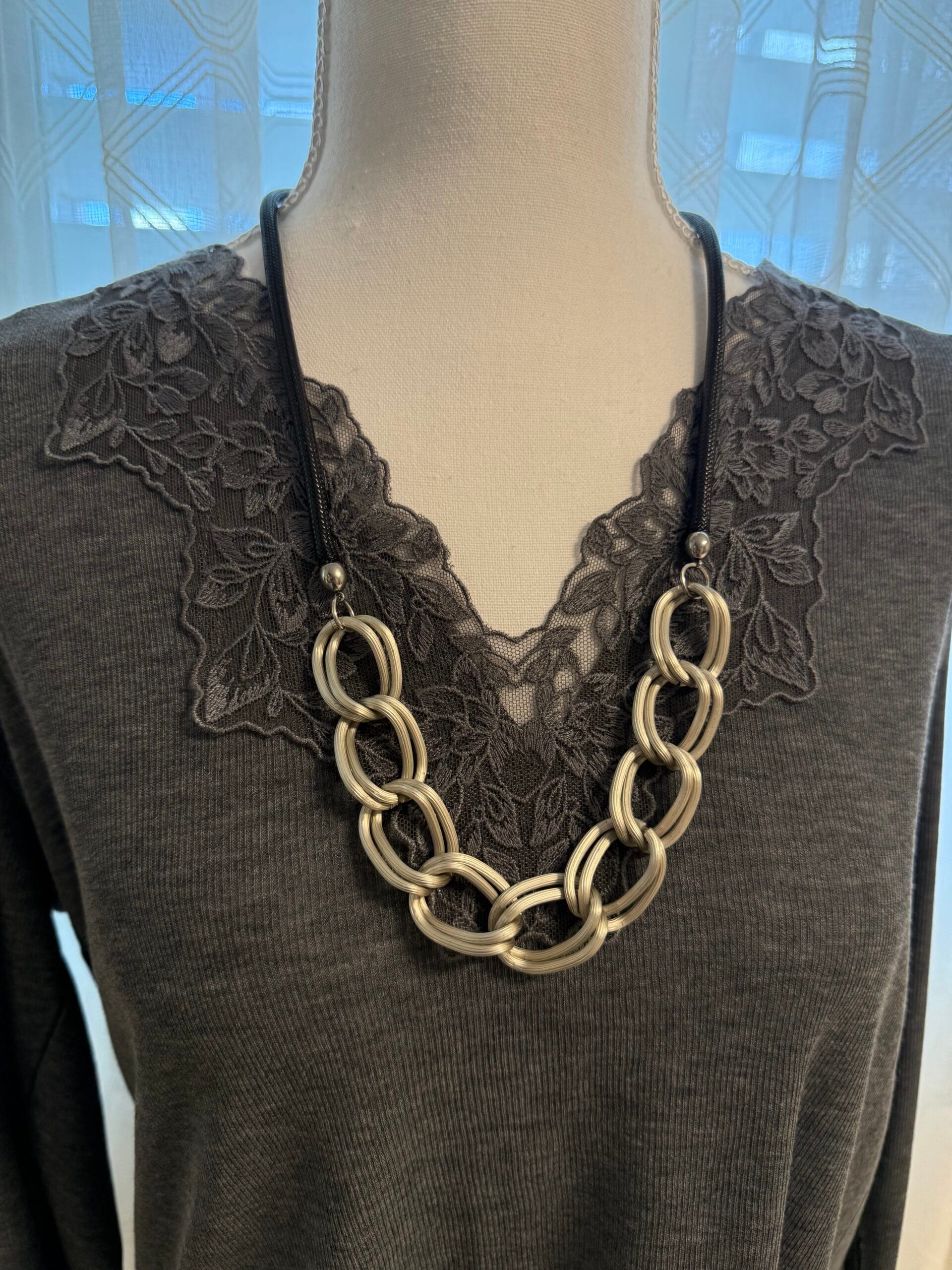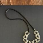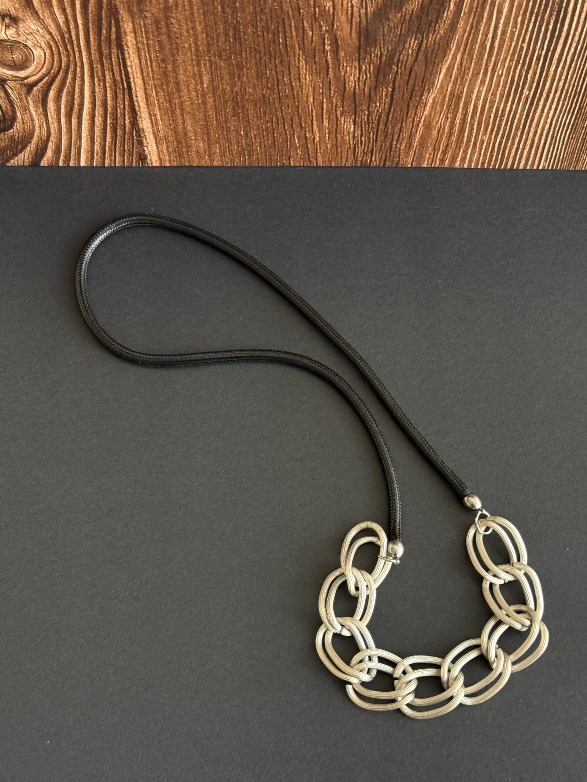 שרשרת שילובים חבל שחור דמוי עור מחובר ללולאות אלומיניום קלילות בציפוי כסוף מט.