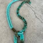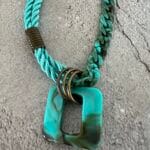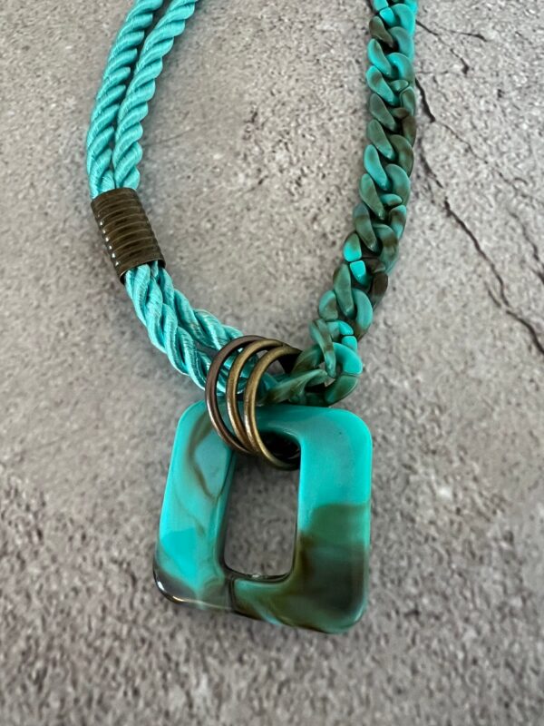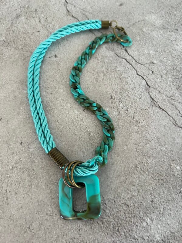 שרשרת שילובים עשויה לולאות פלסטיק וחבל בגווני טורקיז עם תליון אקריל מרובע .