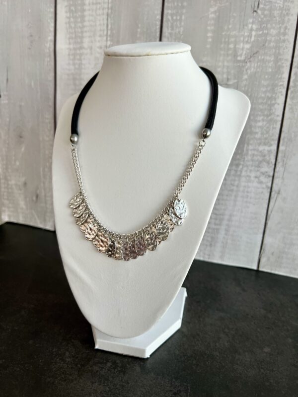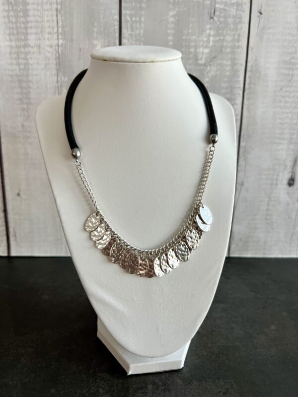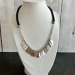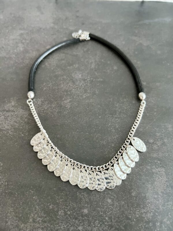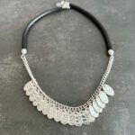 שרשרת שילובים חבל שחור ושרשרת לולאות עם תליוני עלה כסופים מחורצים.