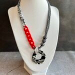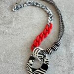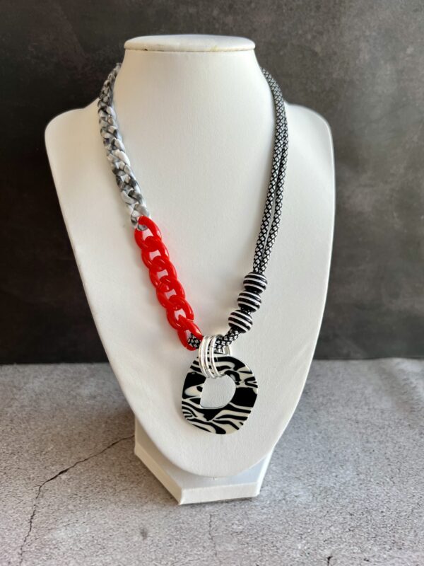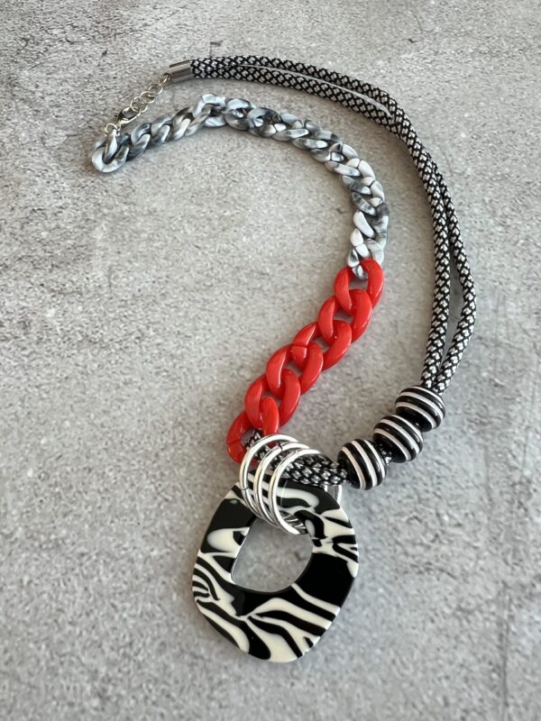 שרשרת שילובים מיוחדת ומקורית שמשלבת חבל בשחור ולבן עם לולאות פלסטיק ותליון בטקסטורת זברה. השרשרת קלילה ותשדרג כל לוק .