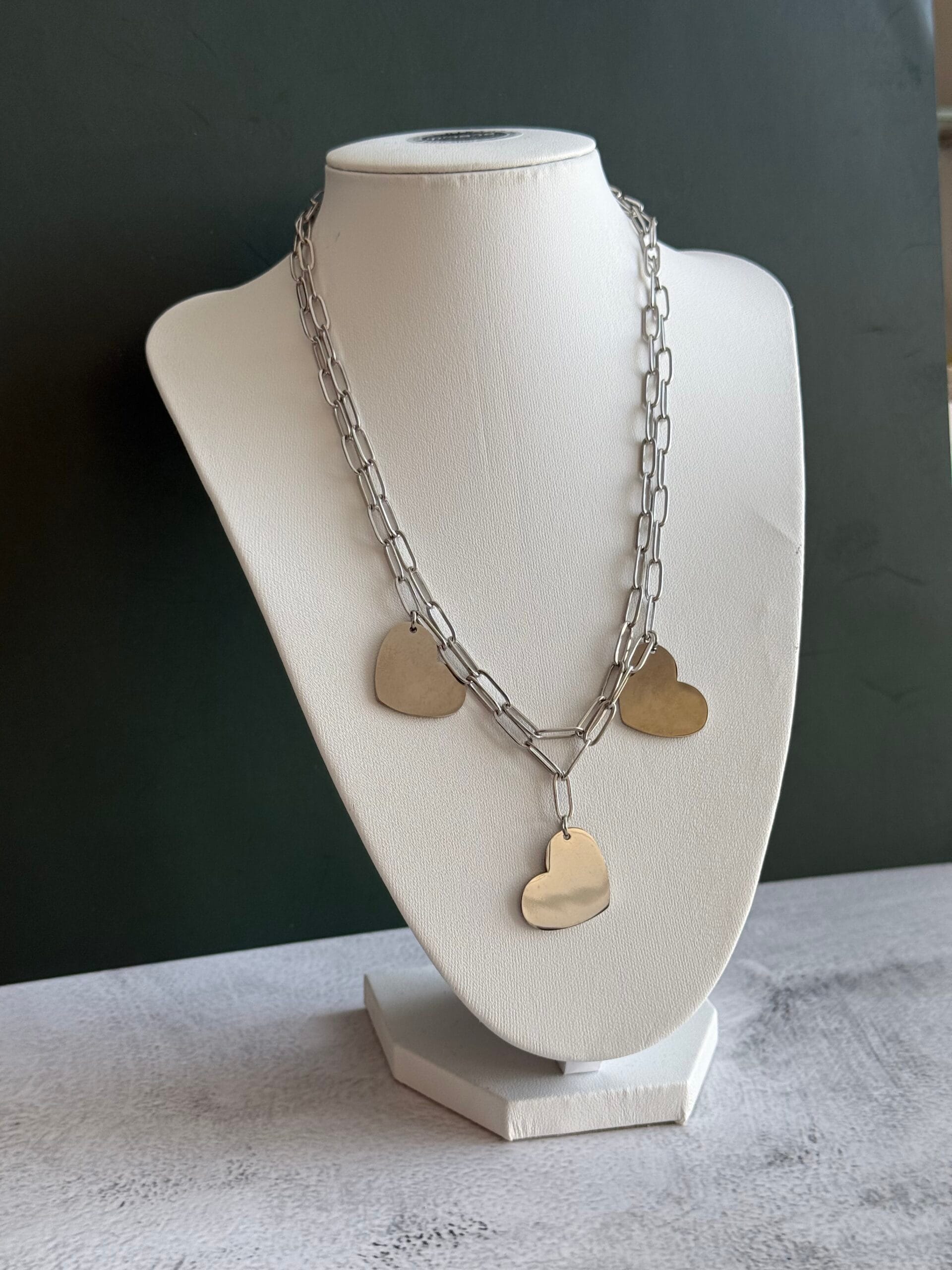 • שלישיית לבבות אייקונית: שלושה תליוני לב במרקם חלק ומבריק המפוזרים במרחקים מדויקים למראה הרמוני.