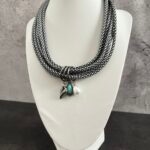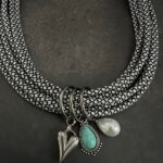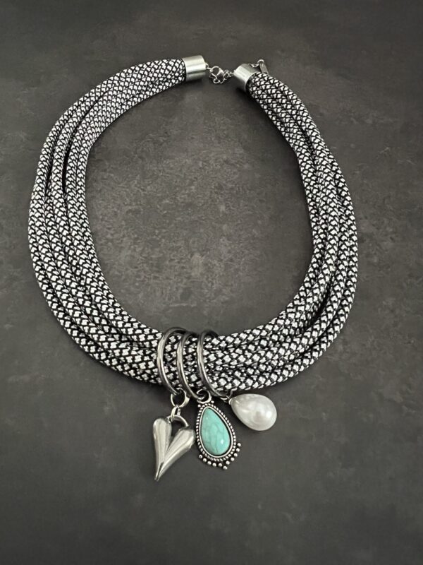 שרשרת שכבות חבלים בשחור ולבן, עם 3 צ׳ארמס מיוחדים, חרוז פנינה, תליון בצבע טורקיז ולב כסוף.
