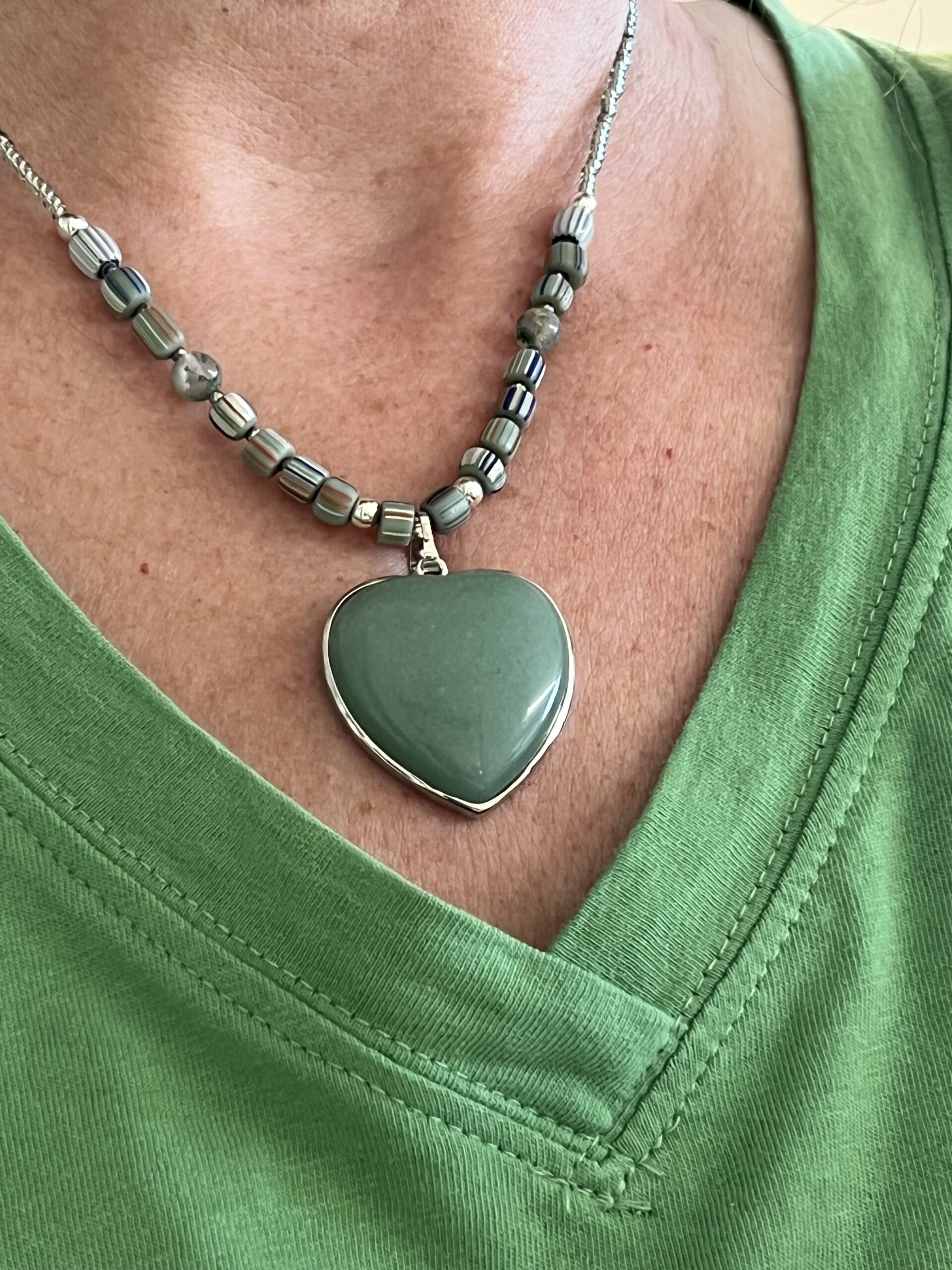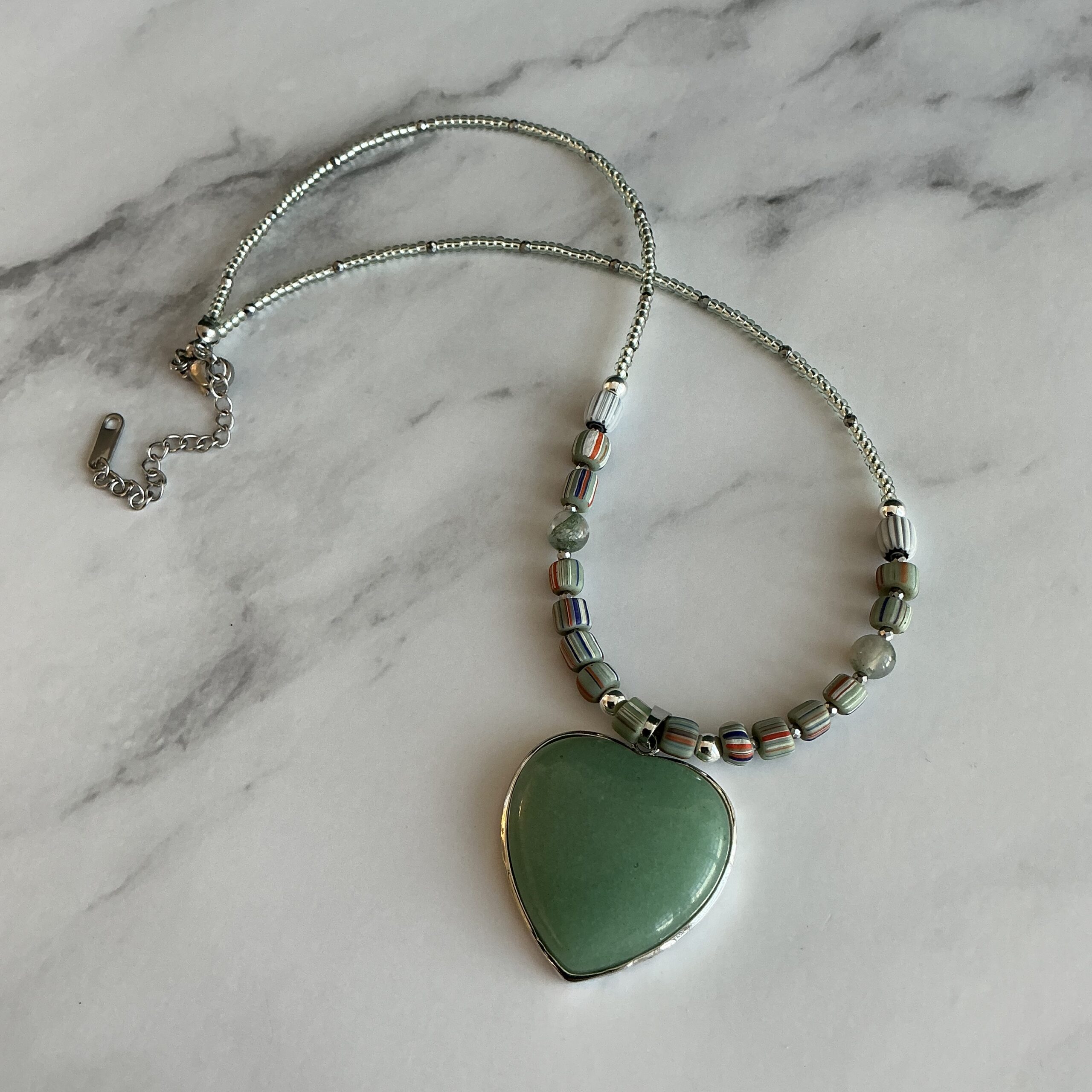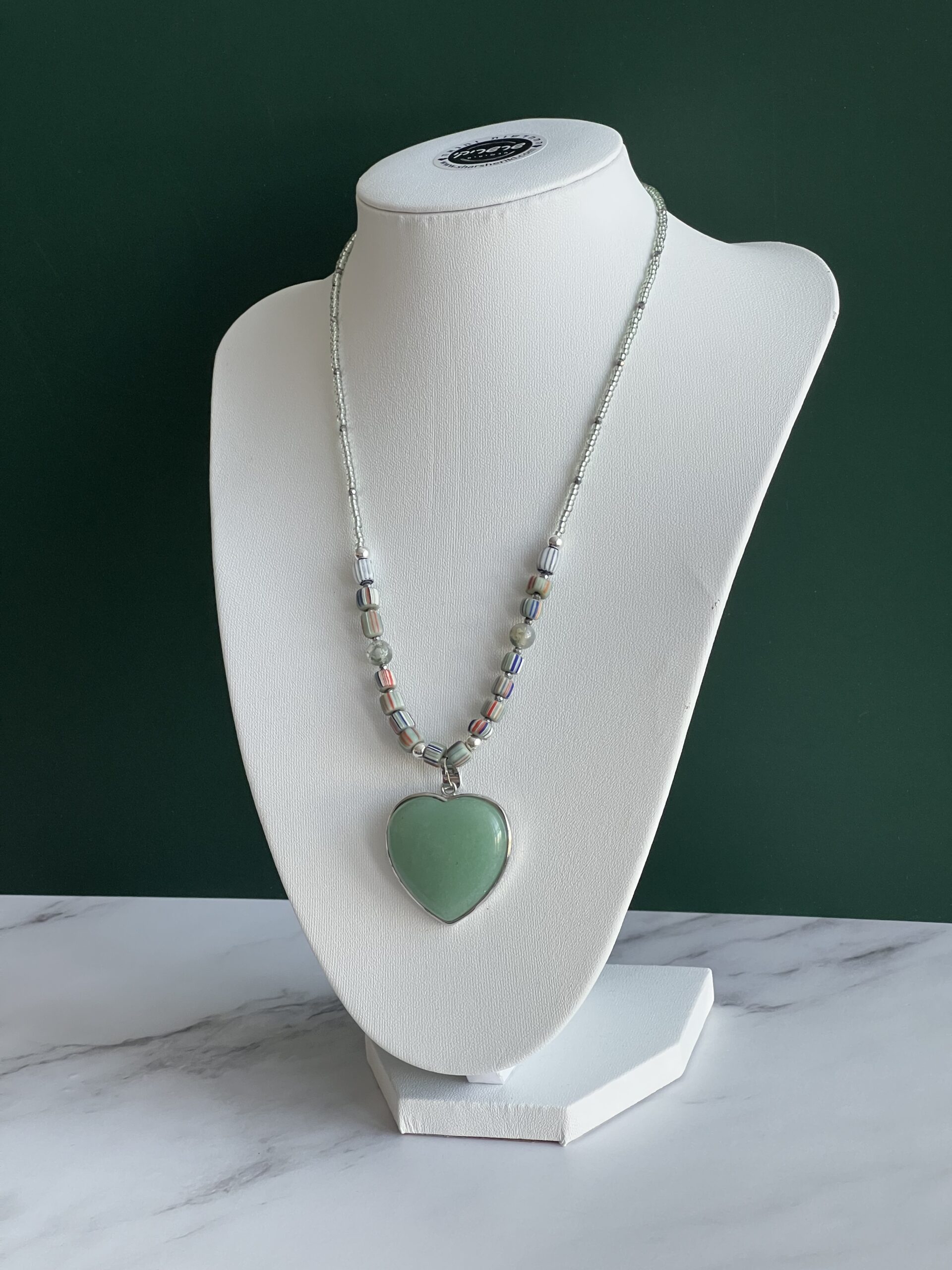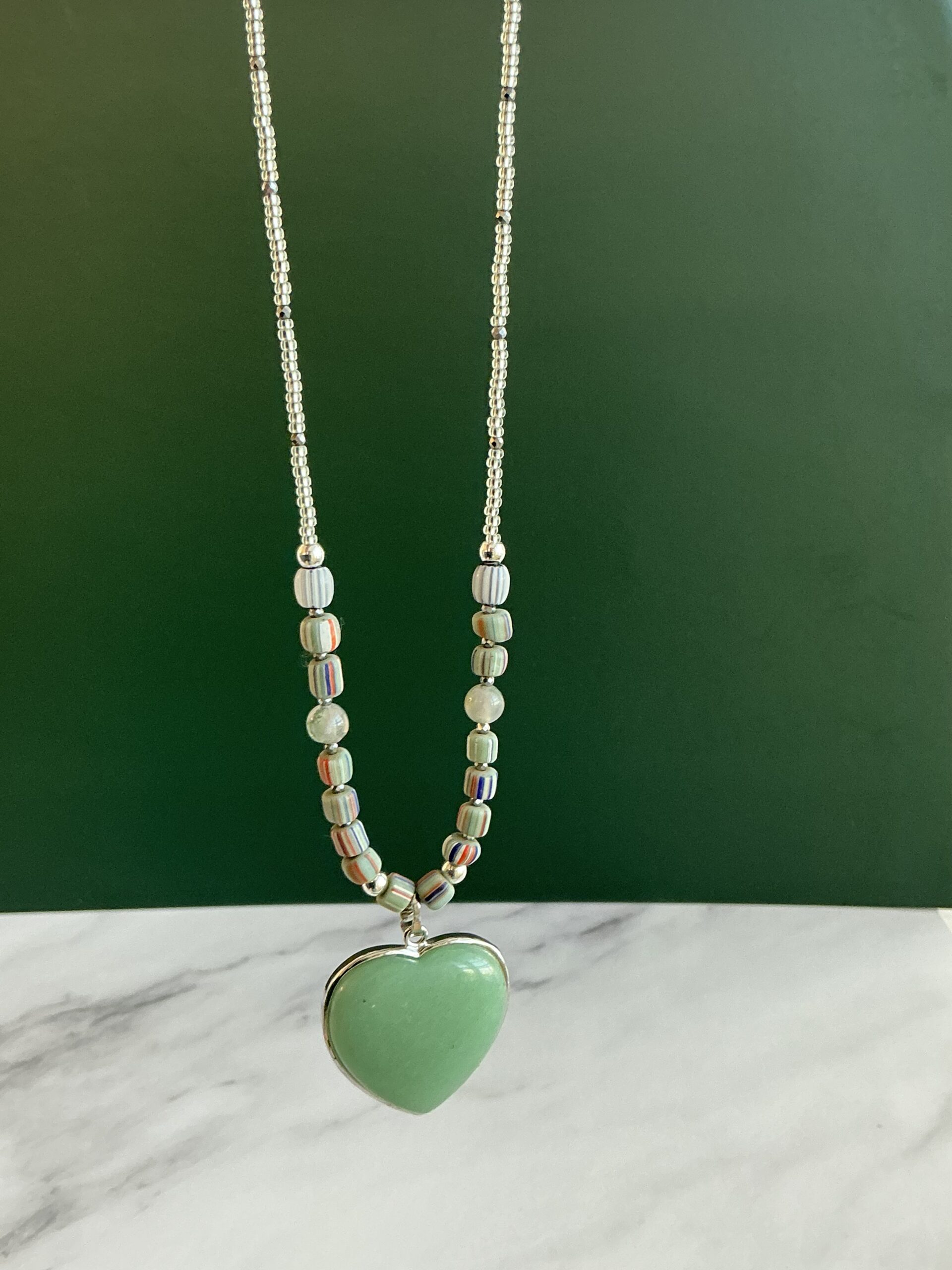 שרשרת בעבודת יד עם תליון לב מאבן חן ירוקה, סמל לאיזון ושלווה.