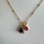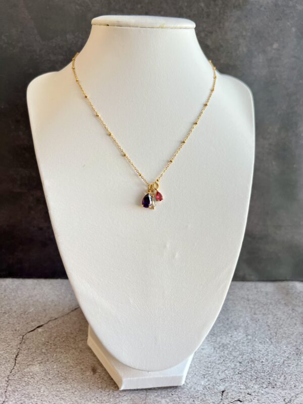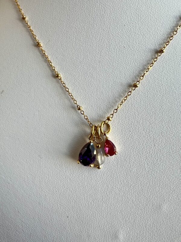 שרשרת לולאות חרוזים אל חלד מצופה זהב איכותי ועליה שלושה צ'ארמס – שניים בסגנון מרקיזה בגוונים סגול ורוד וטיפה שקופה.