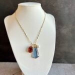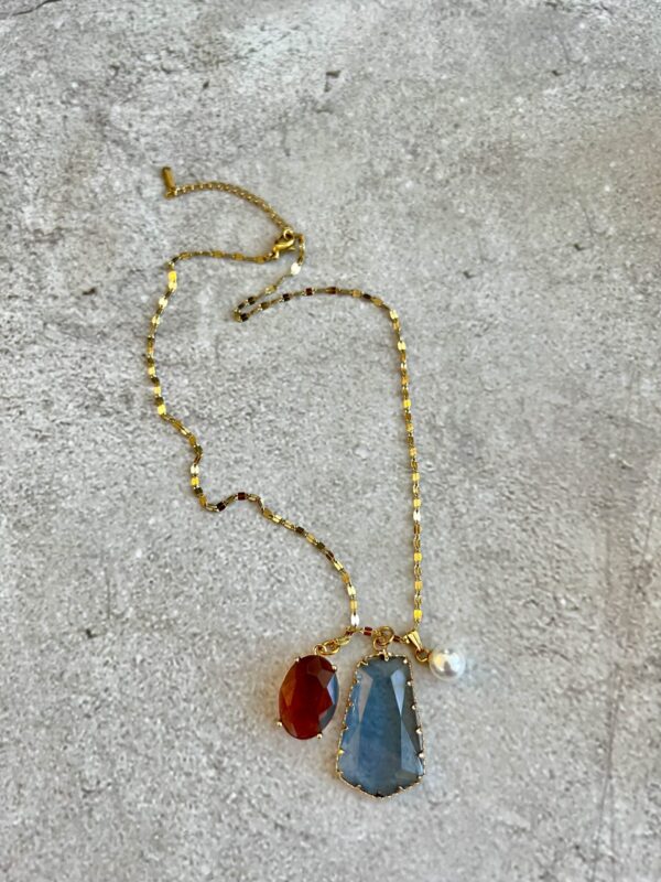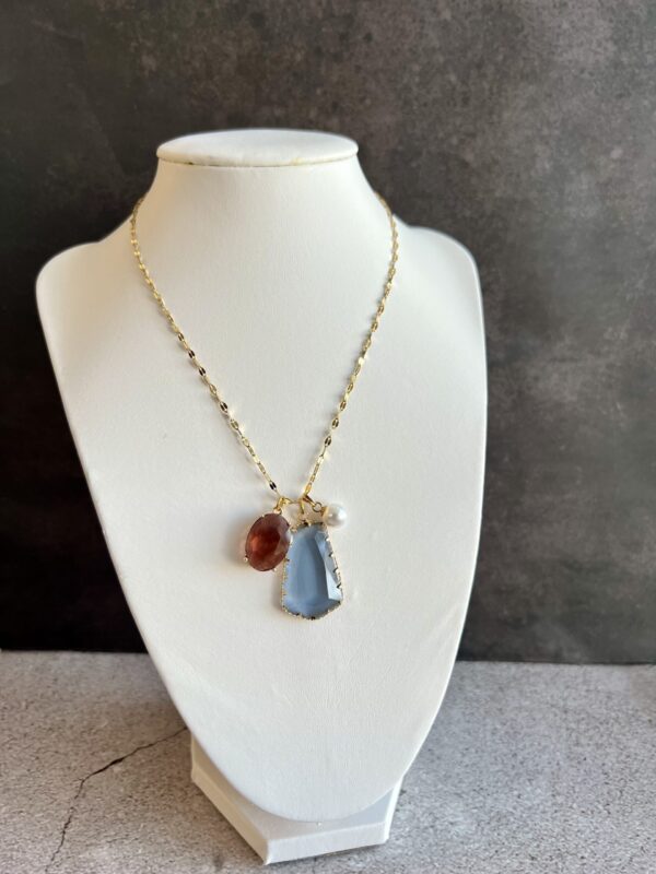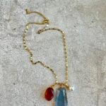 שרשרת אל חלד מצופה זהב איכותי בטקסטורת שפתיים ועליה שלושה צ'ארמס בסגנון מרקיזה האחד בגוון תכלת בהיר והשני בגוון חום בהיר וחרוז פנינה.
